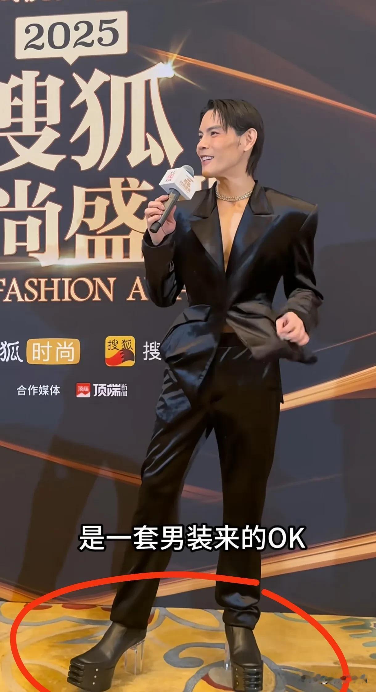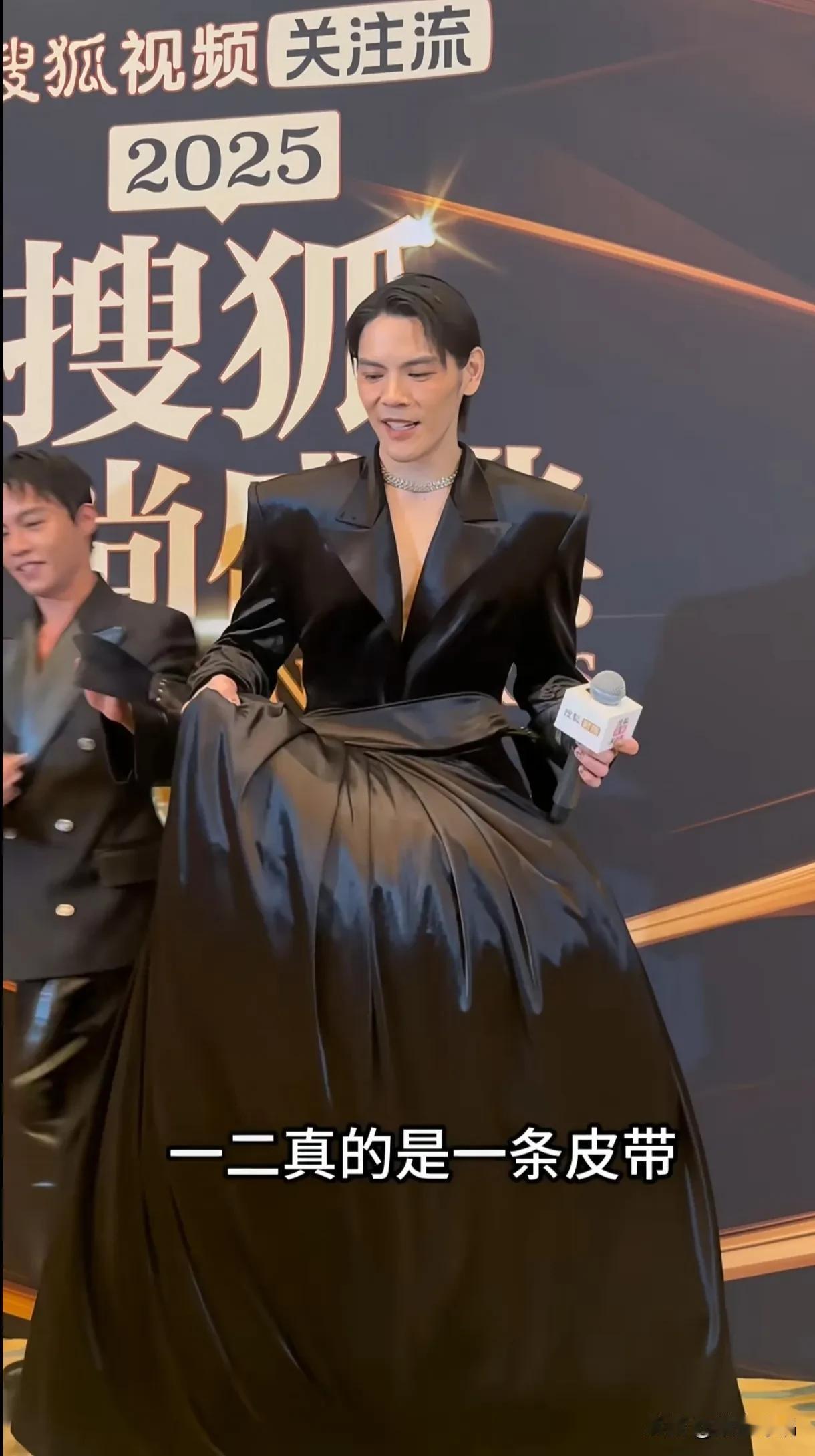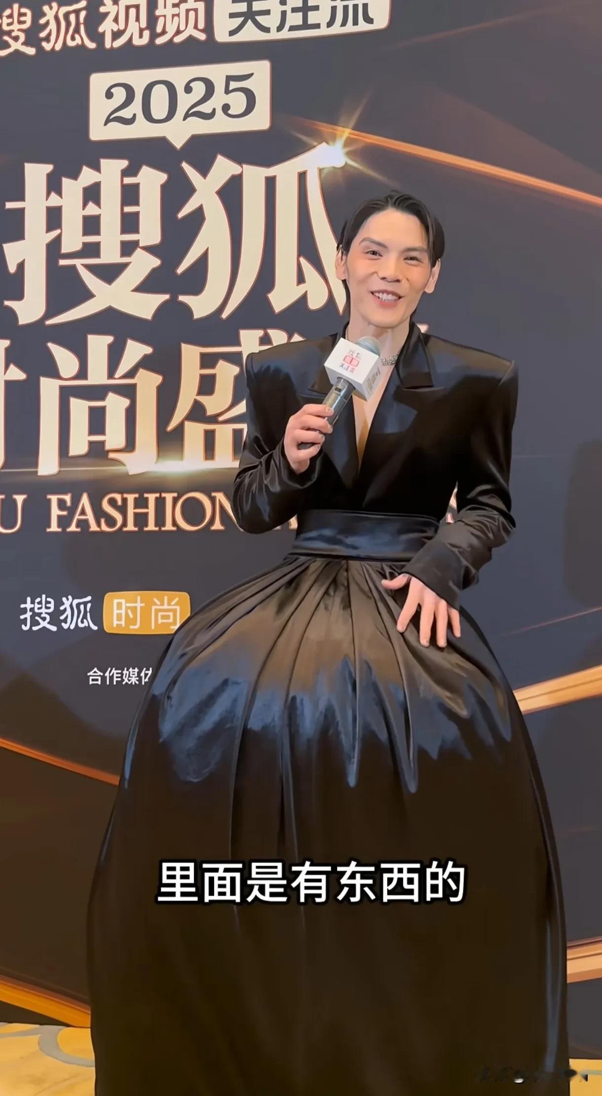 向佐哥哥真的是风韵犹存啊,这样的人不成功都很难吧,这一身衣服,第一眼看过去很像是“黑色塑料”制作成的裙子。 但是相对于往常的裙子,“凸起”面应该是在背面,他倒成了正面,就着实像怀胎数月的肚子。 当记者问他鼓鼓的,里面是什么,他直言道“里面是有东西的”,这么一脱,裙子摇身一变就成了男装,只不过,也难逃观众们的火眼金睛,向佐踩的这个性高跟鞋应该有10公分了。 这哥们,真的全身上下,从里到外都是戏,太有看点了,这么会抓人眼球,他不火谁火?