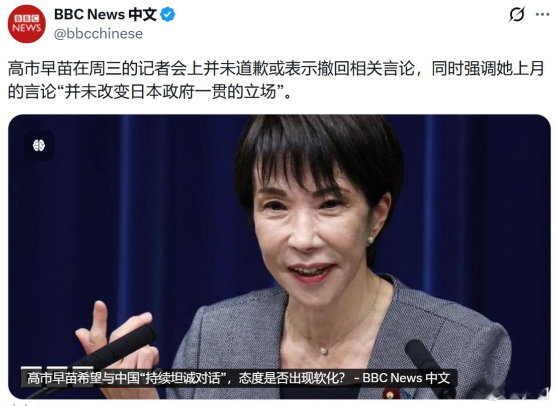 BBC:高市早苗在周三的记者会上并未道歉或表示撤回相关言论,同时强调她上月的言论“并未改变日本政府一贯的立场”。事实证明:狗要咬你,跟狗吵架没有用,哪怕你次次吵赢了,只要你没把它打疼打怕,它下次还敢咬。有些狗,你狠狠打一顿,它不仅不会记恨你,反而大概率成为你的宠物狗。就像日本对美国一样。