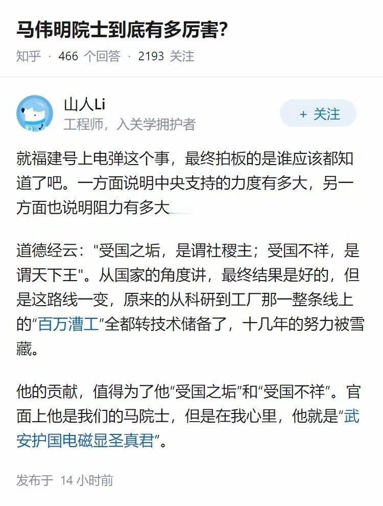 马伟明院士到底有多厉害? 这位网友说的很有道理,一句话总结,以一己之力绕过蒸汽弹射,直接让中国航母进入电磁弹射时代。 自此,中国成为世界上第二个拥有电磁弹射航母的国家。 这还没完,马院士还攻克了潜艇无轴泵推、舰船综合电力系统、高能武器电磁炮等技术。 以一己之力,让中国舰船达到世界领先水平。 正因如此,马院士也被网友称为,武安护国显圣电磁真君!