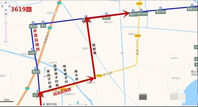 青岛胶州中达巴士3619路公交车(胶州北站——沙梁村)因胶莱往北至北店子到麦丘路段破损,造成3169路公交车无法通行,即日起临时调整运行线路由胶莱走S217至闸子集至刘家荒到南顶子,增加南店子村南、陈家闸子村西、陈家闸子村、闸子桥,上行反之。不再经过南店子、北店子、麦丘西、麦丘、田成屯。