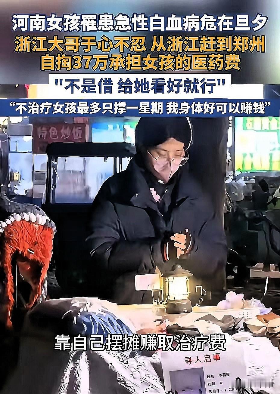 浙江大哥37万救陌生姑娘! 善良成新闻,到底该喜还是该忧? 浙江打工大哥这波操作,真的看哭无数人!素不相识的河南23岁姑娘白血病恶化,医生说撑不过一周,他刷到新闻连夜赶去郑州,直接掏出37万积蓄:“不是借,就是给她治病,我身体好能再赚”。 大哥的举动,不仅救了一个姑娘,更唤醒了很多人心里沉睡的善意。[赞][赞]