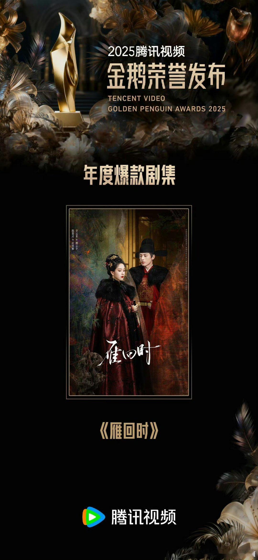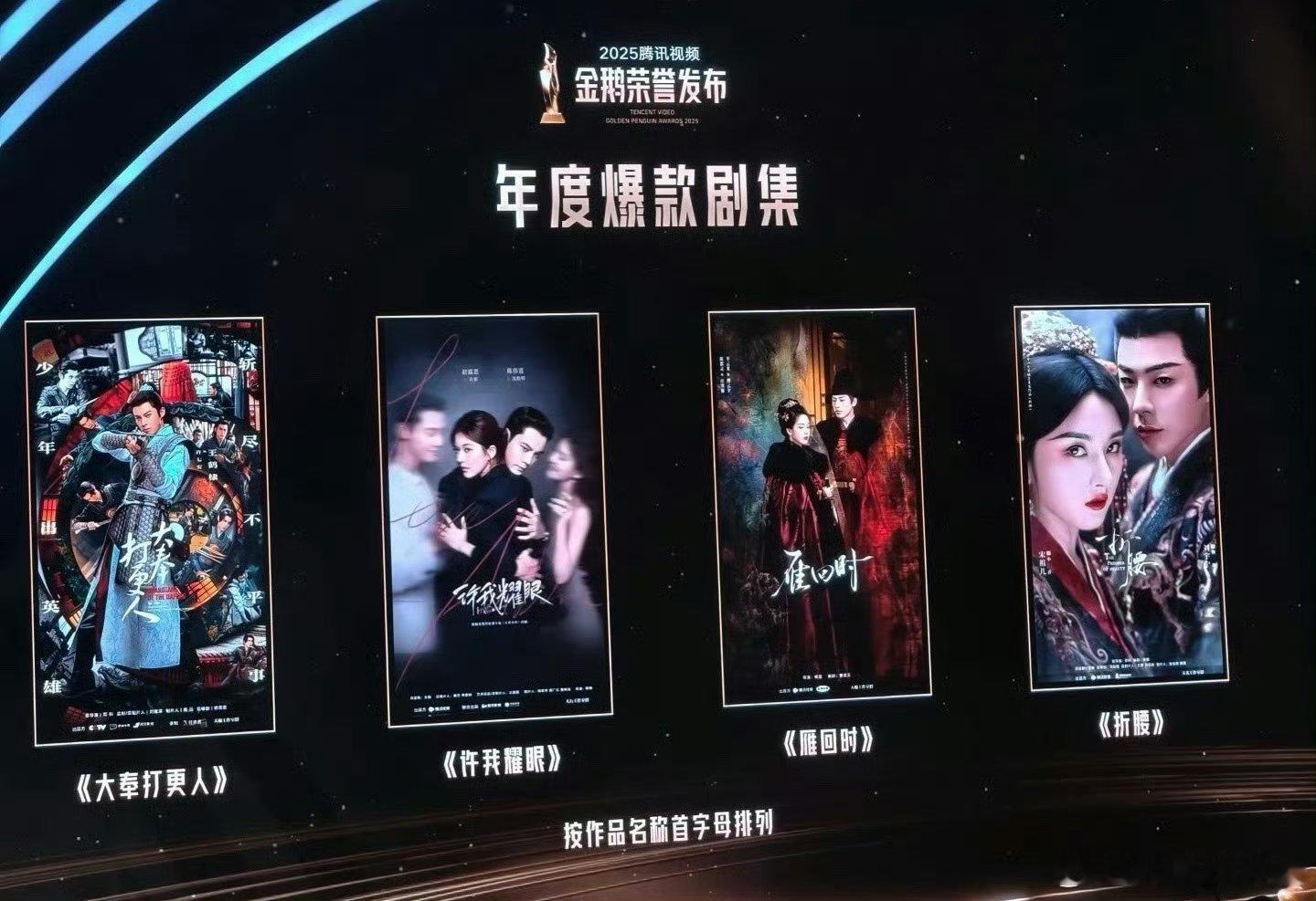 金鹅奖发布腾讯认证的腾讯年度爆剧——王鹤棣、田曦薇《大奉打更人》赵露思、陈伟霆《许我耀眼》陈都灵、辛云来《雁回时》宋祖儿、刘宇宁《折腰》