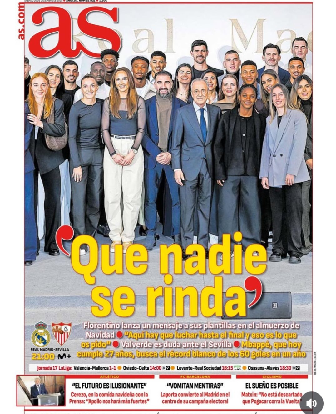皇马 《阿斯》“没有人会放弃”弗洛伦蒂诺在圣诞晚宴上向球队传达这样的信息“在这里必须战斗到最后一刻,这是我对你们的要求”巴尔韦德能否出战与塞维利亚的比赛存疑今天27岁生日的姆巴佩寻求打破皇马一年60球的纪录