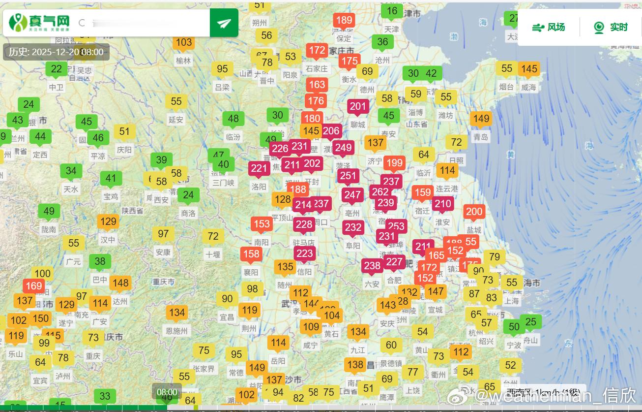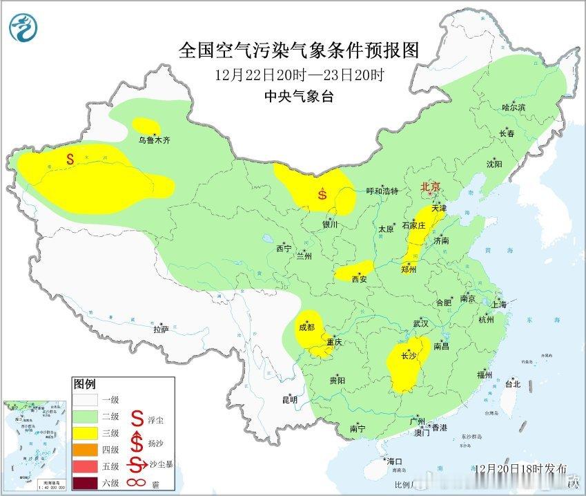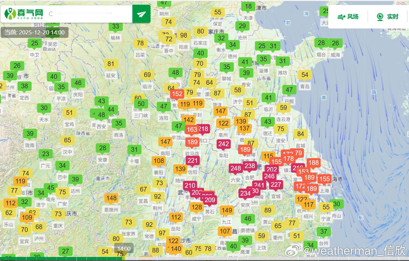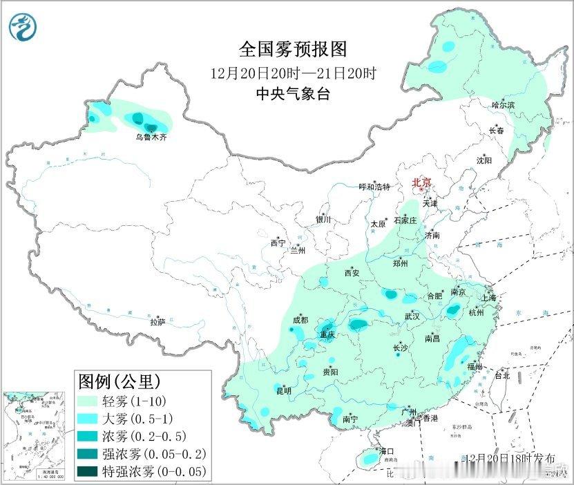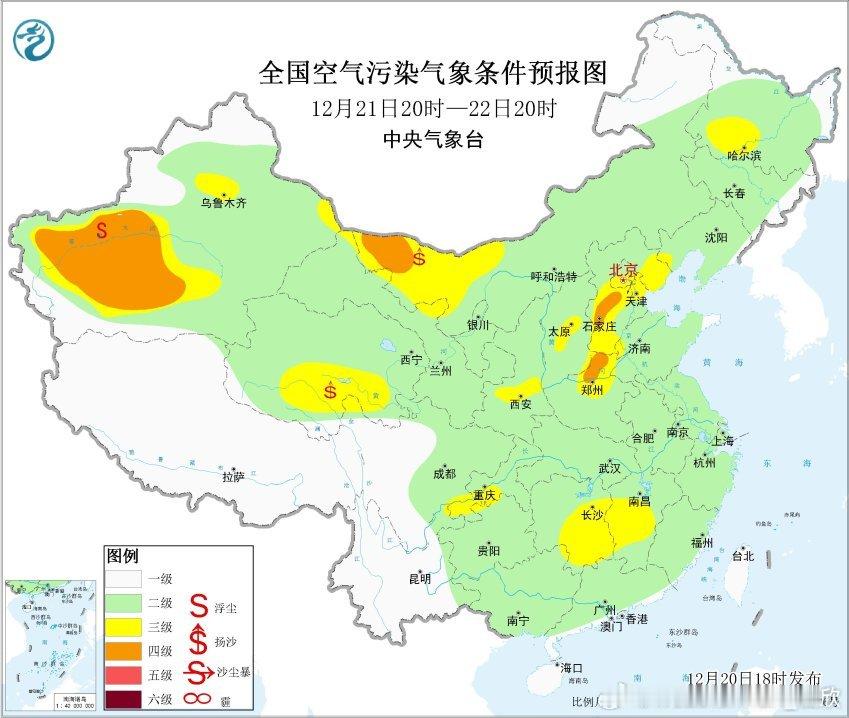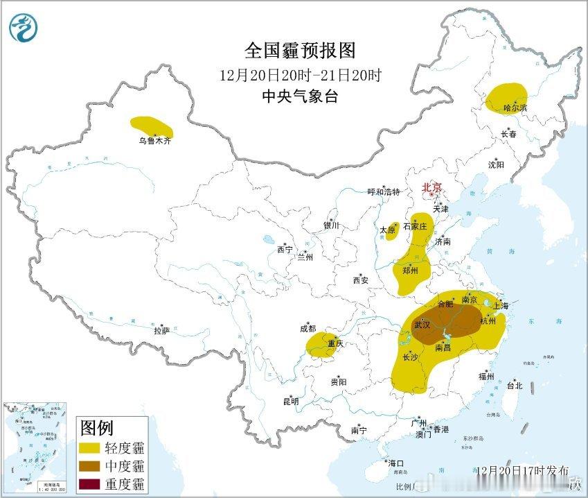 【雾和霾】今天随着冷空气南下,污染对应的霾,呈现向南转移的趋势,但是污染没有被彻底清除,南下过程中,有所减弱。今晚20时,浙江杭州、绍兴,安徽铜陵、池州、安庆、六安、淮南、阜阳,江西九江、湖北咸宁、鄂州、孝感,空气质量重污染。今晚到明天随着北风减弱,近地面转为偏东风,污染可能在长江中下游沿线持续并略向西推进,不过因为有降水,可能也会起到一定消除作用。后天转为南风后,部分污染可能还会向北回返。23日又有冷空气南下,华北污染应该不会累积起来。另外23日黄淮等地也有降水,对残存的霾也有清除作用。另外20日夜间至21日上午,新疆天山北坡、湖北中西部、安徽南部、福建西部、四川盆地南部等地的部分地区有大雾天气,局地有能见度不足200米的强浓雾。