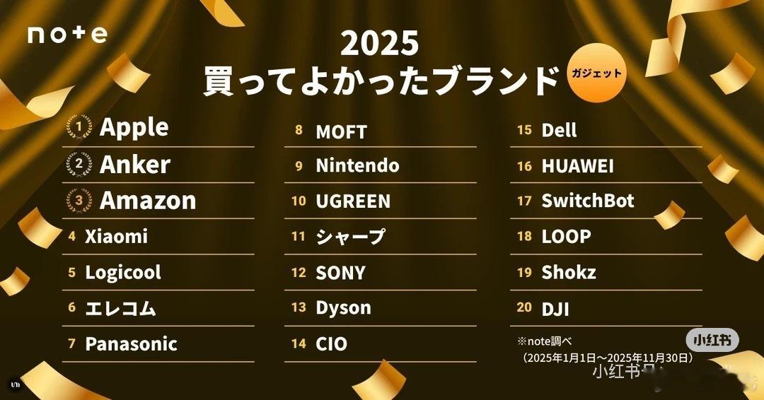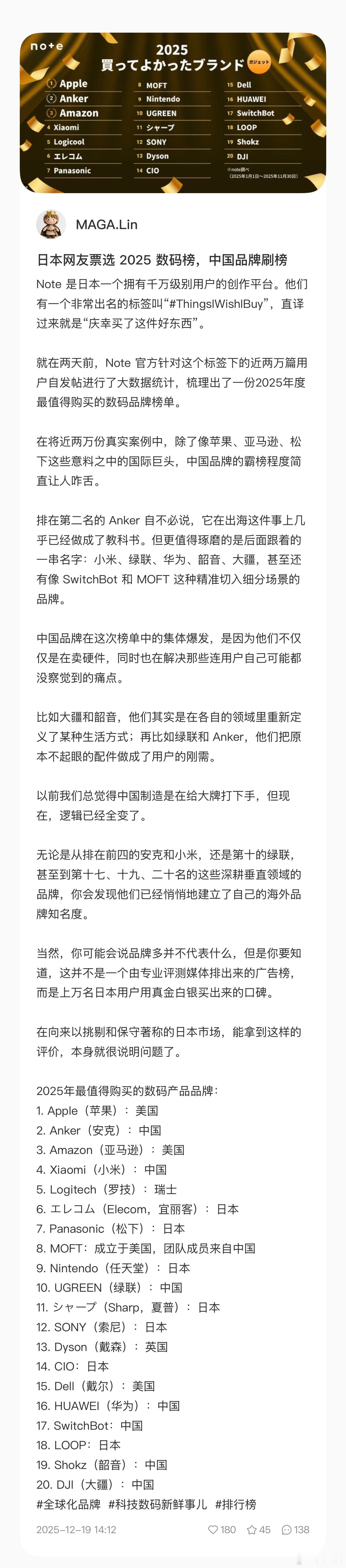 海外知名创作平台NOTE基于近两万条用户真实分享,最后统计出了2025最值得买的数码品牌榜中国品牌在这份榜单里存在感还是相当强的,小米第四,Anker第二,绿联、华为、SwitchBot、韶音、大疆等也纷纷上榜,覆盖手机、配件、影音、无人机等多个赛道。不管是小米这种头部中国品牌还是细分领域的各个品牌,都靠产品力拿下海外用户认可,必须值得吹一波