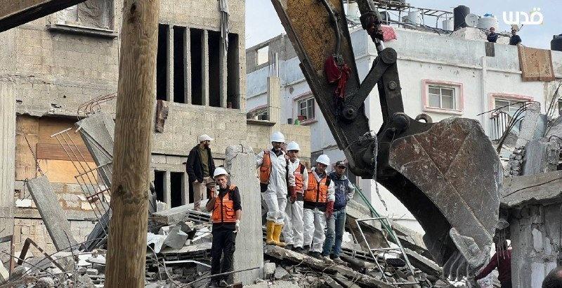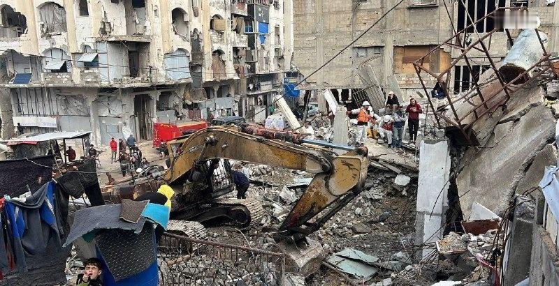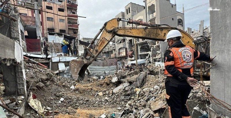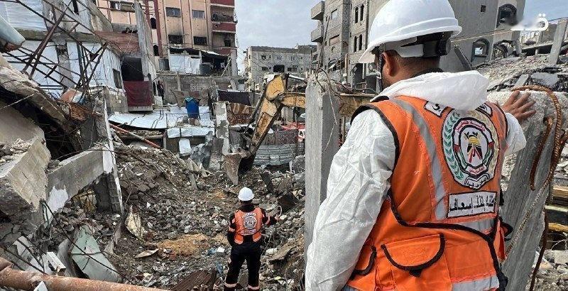 在加沙地带南部汗尤尼斯市,巴勒斯坦民防部门开始在被以色列军队摧毁的 13 栋房屋废墟下搜寻 55 具平民遗体。
