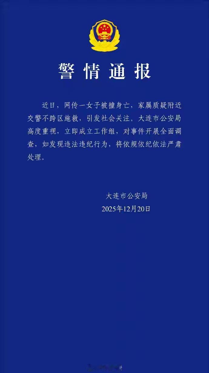 大连警方通报“网传一女子被撞身亡,家属质疑附近交警不跨区施救”:成立工作组,全面调查这一通报的发布,迅速引发了社会各界的广泛关注。众多网友纷纷在评论区表达自己的看法,有人期待调查能给出一个公正透明的结果,还原事件的真实全貌;也有人认为在事情真相未明之前,应保持理性,避免盲目猜测和传播不实信息。 据了解,此前网络上流传的视频画面令人揪心,女子遭遇不幸后,家属情绪激动,质疑附近交警未及时跨区施救。这一质疑不仅牵动着家属的心,也让公众对事件背后的具体情况充满了好奇。 目前,大连警方成立的工作组已开始紧锣密鼓地开展工作。他们将对事件涉及的各个环节进行细致梳理,包括事发时的交通状况、交警的职责范围和工作安排、救援的具体流程等。相信在专业严谨的调查下,真相会逐渐浮出水面。 后续,我们也将持续关注该事件的调查进展,第一时间为大家带来最新消息。希望最终的调查结果能给家属一个交代,也能让公众对事件有一个清晰准确的认知。
