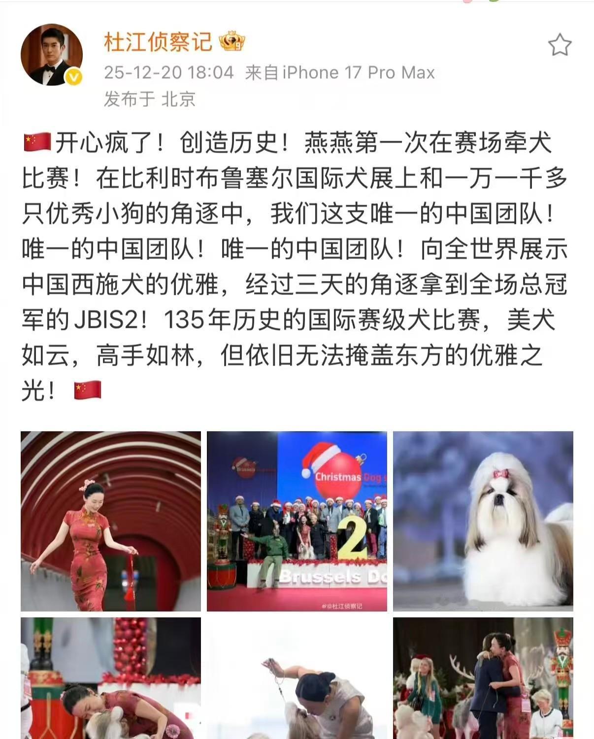 霍思燕这是在新赛道大放光彩了啊!她的赛级西施犬在布鲁塞尔国际犬展上拿了全场总冠军的亚军,也算为国争光了。 霍思燕还穿上了传统服饰旗袍,与来自中国的犬种在角逐中拿到了好名次。 养狗的明星很多,能在国际犬赛拿奖的明星实在是太少了。 并不是有钱有时间就能办到的事,杜江两口子是真的喜欢狗,也舍得投入足够多的精力。