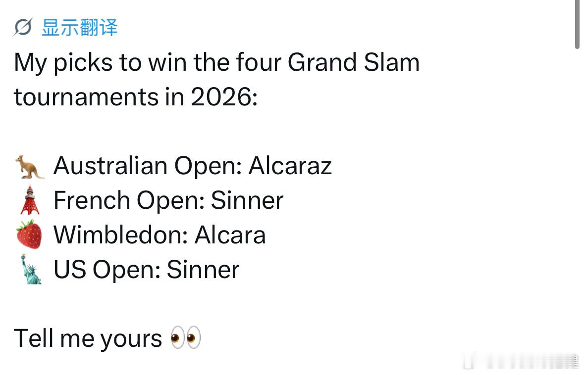 外网预测的2026四大满贯男单冠军,你们觉得靠谱吗?澳网:阿尔卡拉斯法网:辛纳温网:阿尔卡拉斯美网:辛纳热点现场