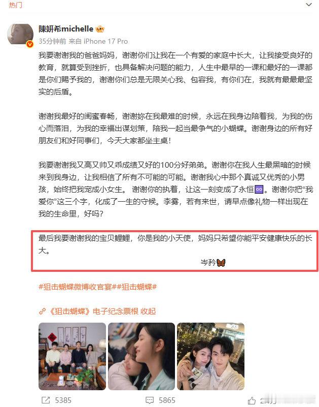 陈妍希说鲤鲤是岑矜的小天使陈妍希很舍不得狙击蝴蝶《狙击蝴蝶》陈妍希说鲤鲤是岑矜的小天使!女儿真的很可爱~蝶蝶乐也好舍不得岑矜感谢这么好的岑矜出现在我们的生命里🦋我们下个角色见