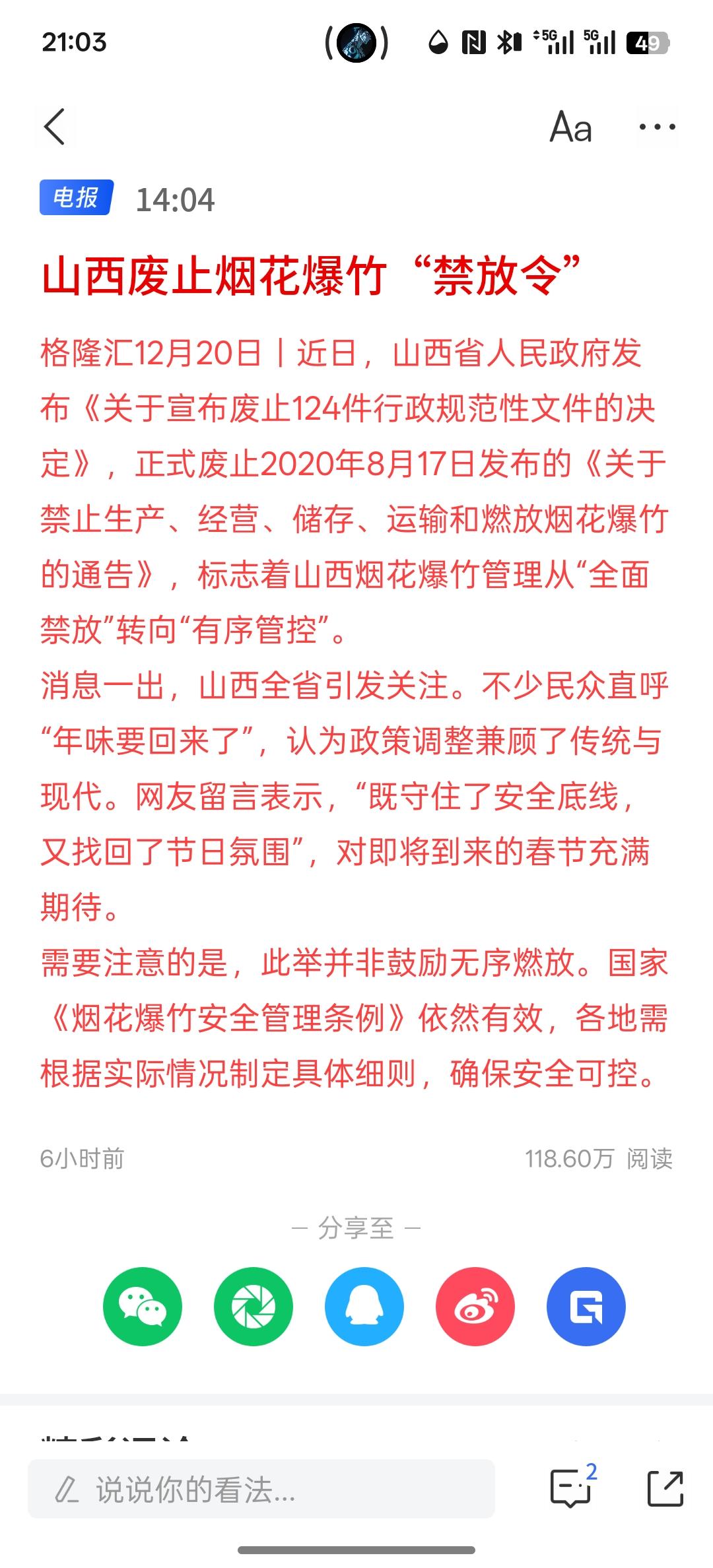 山西废止烟花爆竹“禁放令”,这个政策非常好,只要守住安全底线,确保安全可控,让老百姓能够在逢年过节放烟花。其实,他就是一个非常开心快乐的事情!逢年过节能带来喜庆!烟花是中华民族几千年的传承,你们逢年过节都需要放烟花,老百姓能够感受真正的年味,过年新衣服,放着烟花,就有浓浓的年味,就比较热闹!