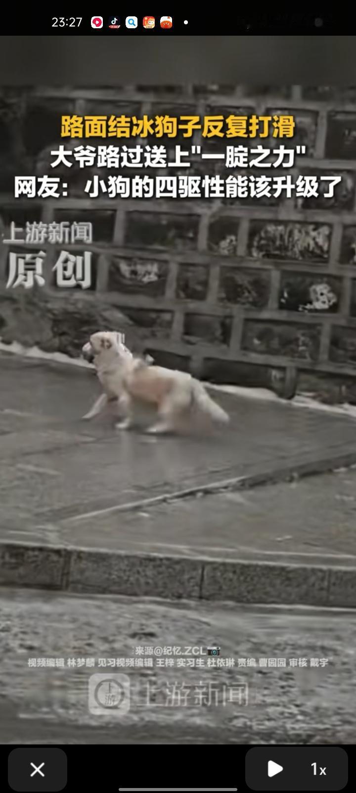 12月20日,吉林白山。网友晒视频称,路面结冰,狗子上坡反复打滑,一位大爷路过送上“一腚之力”, 瞬间画面变得特别温馨,为这个寒冷的冬天添了一丝暖意。有网友调侃,小狗的四驱性能该升级了。