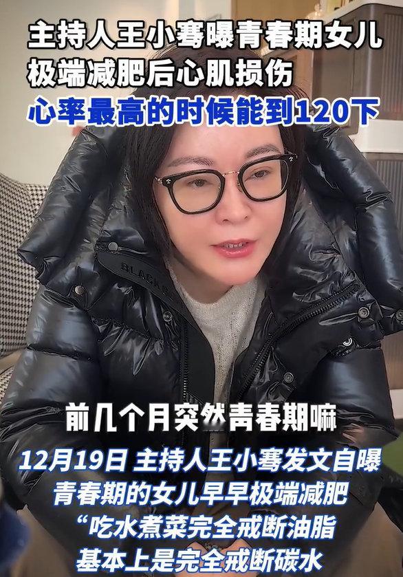 【王小骞曝女儿极端减肥后心肌损伤】王小骞抹泪说自己不称职 12月19日,主持人王小骞发文:亲爱的职场妈妈,咱们都慢下脚步吧。其表示,青春期的女儿早早极端减肥,“吃水煮菜完全戒断油脂,基本上是完全戒断碳水,蛋白质吃的也非常少。”前一段时间,女儿病毒感染和细菌感染,“心率最高的时候能到120下,被判定为心肌损伤”。王小骞视频中抹泪说自己不称职,前些年为了事业忽略了孩子,现在想多给女儿一些关注。