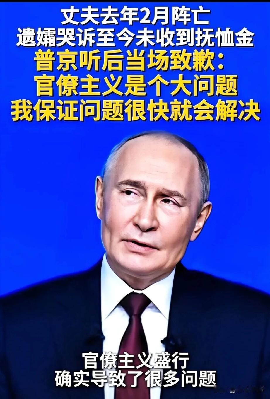 普京真是一个敢直面问题的总统!! 面对士兵遗孀哭诉未领到抚恤金的遭遇,当场致歉,就相关部门办事效率低下致歉,直言官僚主义催生文件丢失、部门决策拖延等弊病,明确表态针对此类问题开展专项整治,同时向遗孀承诺,其问题会很快得到解决。 民众能将自身困难直接反馈上来,印证民意沟通渠道畅通有效。不袒护、不推诿、不回避负面影响,致歉担责后深挖问题根源推动整改,最终保障民众诉求快速落实。这样的行事作风,立足民众切身利益解决实际问题,以务实举措破除官僚主义弊病,值得肯定,亦是民众之幸。