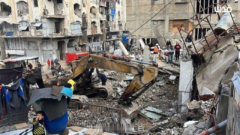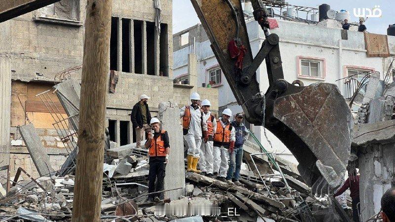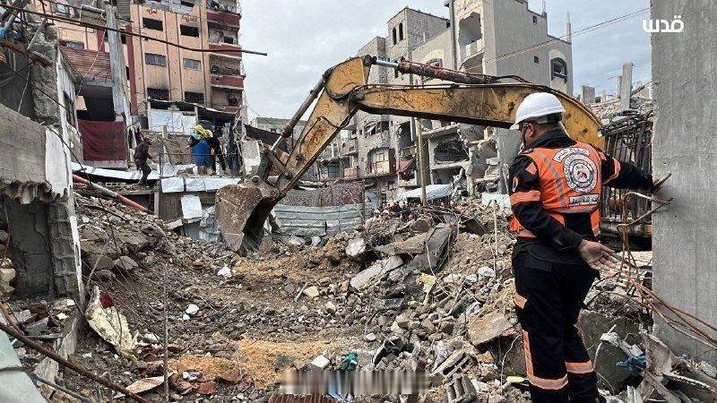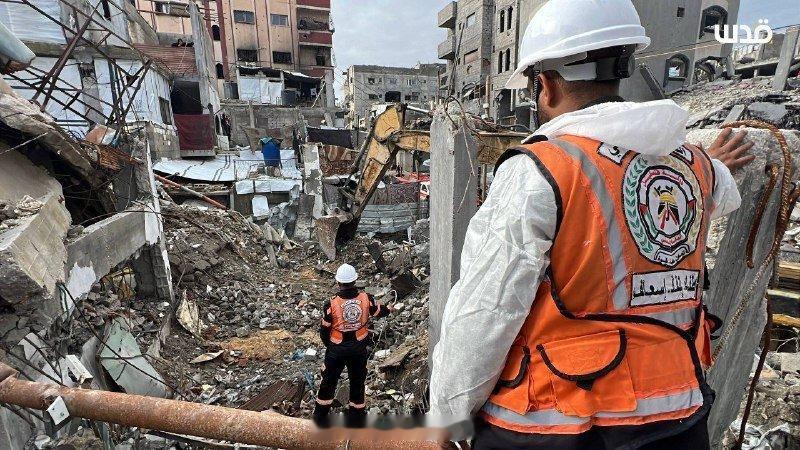 在加沙地带南部汗尤尼斯市,巴勒斯坦民防部门开始在被以色列军队摧毁的 13 栋房屋废墟下搜寻 55 具平民遗体。