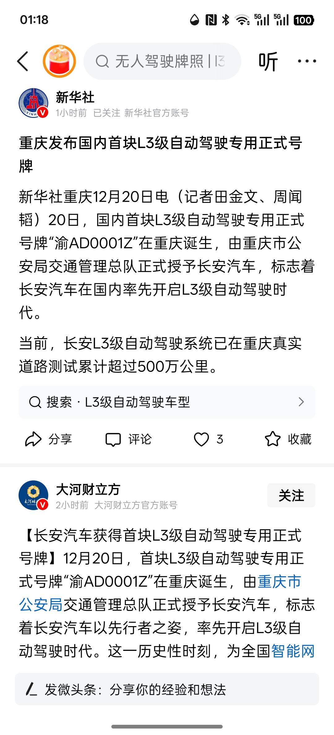 意义重大,重庆发布国内首块L3级自动驾驶专用正式号牌,这也标志着长安汽车进一步现在自动驾驶技术领域快速落地! 这对中国汽车行业发展拥有重大的意义,这也标志着我国正式进入自动驾驶技术领域实现了商用,未来将会有更多的自动驾驶汽车真正上路使用! 这是中国汽车制造业重要的里程碑!中国的新能源汽车已经开启了另一片新的发展,创新之路的新篇章!中国的汽车也正式进入了智能化时代!
