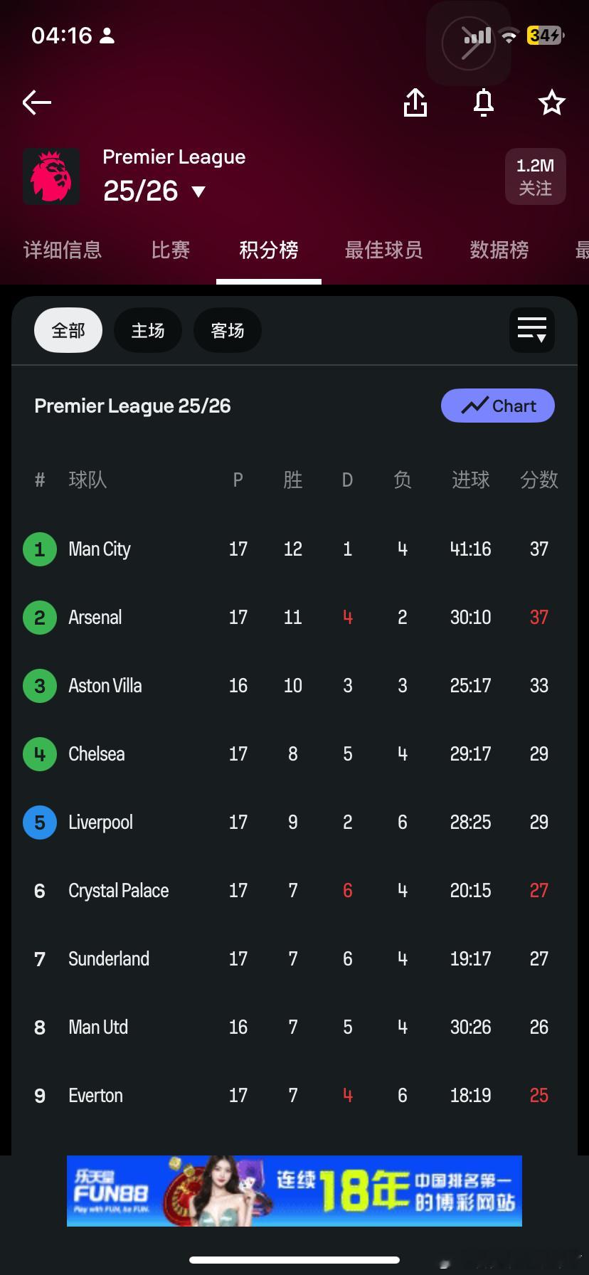 在看一眼积分榜和切尔西同分了