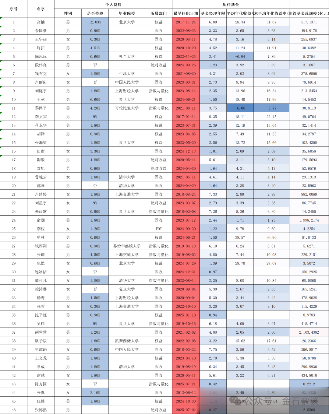 1)权益高光,固收落寞。据金石杂谈统计,目前未进入激励计划的基金经理分别为:段伟良、卢丽阳、郭画、连冰洁、徐沛琳、陈方圆。其中,一位是指数量化、一位是绝对收益,还有4位基金经理则是做固收的,而权益基金经理全部加入了员工持股计划。