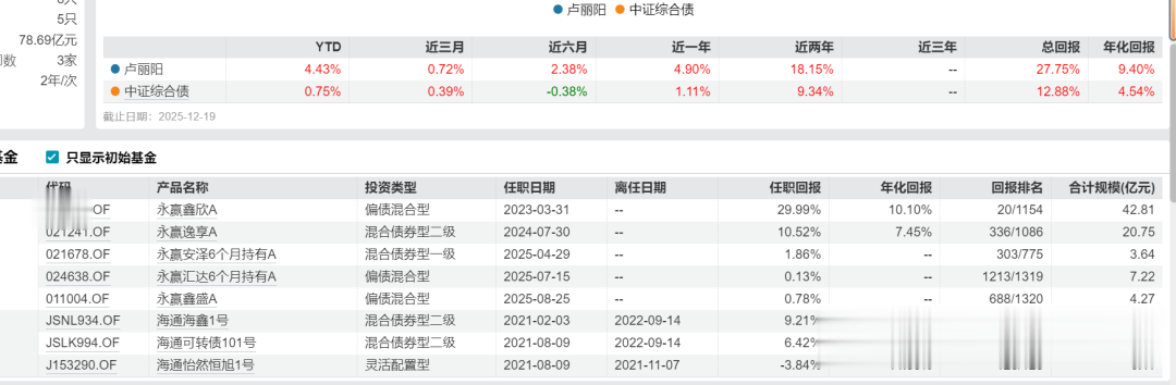 3)不过,还有一位固收基金经理卢丽阳有点惨,近1年收益4.9%,今年收益大幅跑赢基准,近2年收益也超18%;而且其管理规模也从去年底的39.48亿暴增至目前的78.69亿,规模翻倍。