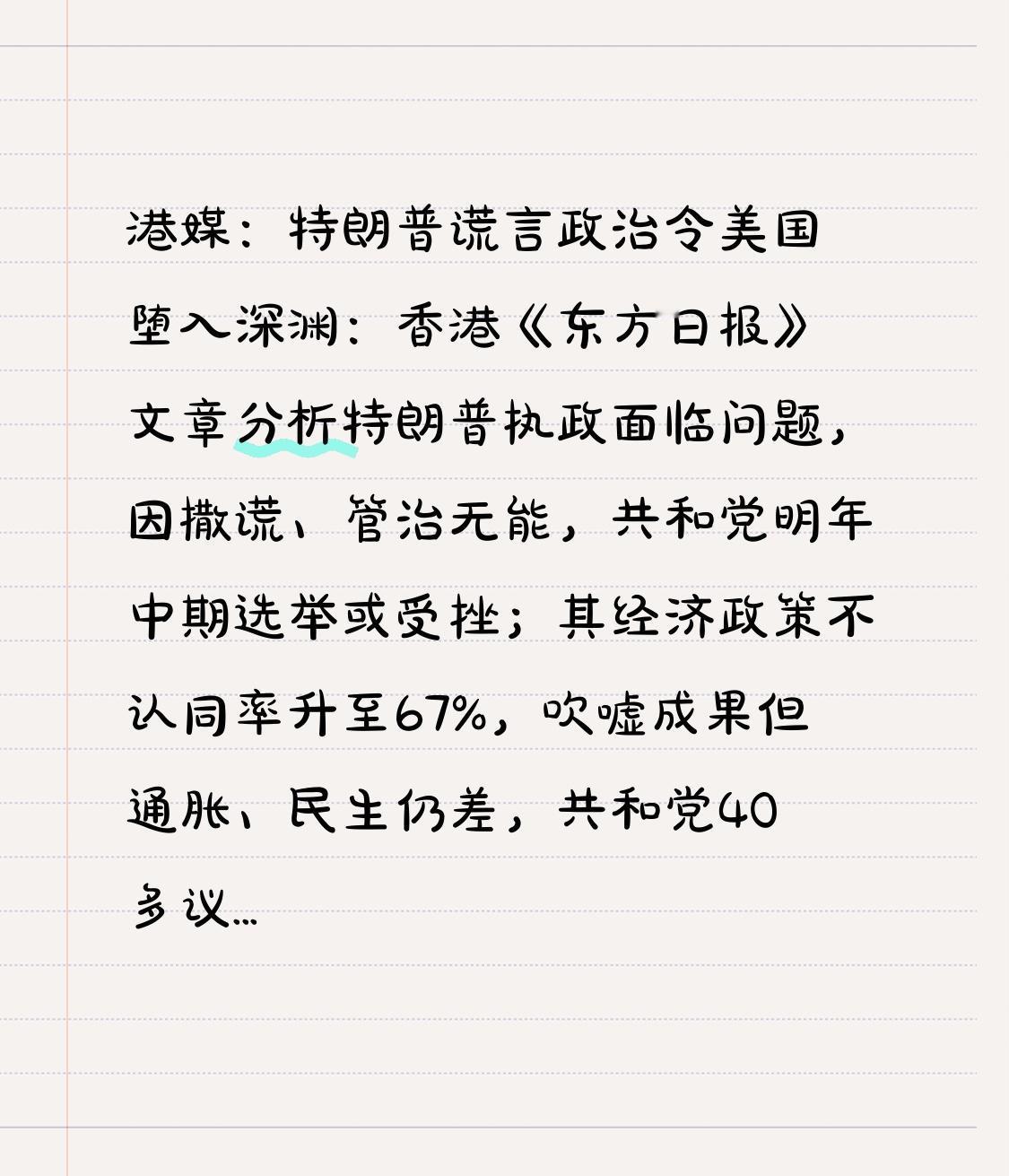 港媒:特朗普谎言政治令美国堕入深渊:香港《东方日报》文章分析特朗普执政面临问题,因撒谎、管治无能,共和党明年中期选举或受挫;其经济政策不认同率升至67%,吹嘘成果但通胀、民生仍差,共和党40多议员计划退休;外交局势紧张,民众盼改善经济,继续倒行逆施会令美国衰败。