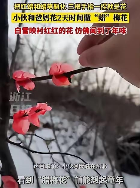 “万万没想到!”吉林一小伙带女朋友回家见父母,谁知,女友刚到他家就看到院子里腊梅开得正盛,便凑近想要闻花香,结果手指一碰发现居然是蜡做的!小伙接下来的解释让女友感动又温暖! 这事儿发生在吉林通化,冬天的东北,放眼望去全是白茫茫一片,冷得哈气都能结冰。小伙带的是南方女友,姑娘长这么大还是头回见这么厚的雪,眼睛都亮了。刚进院子,就瞅见角落里一棵树上“开”着满枝通红的花,在雪地里特别扎眼,看着就像真腊梅似的。 姑娘稀罕坏了,赶紧跑过去想闻闻香味,手一碰到花瓣,哎?不对啊,硬邦邦的,还滑溜溜的,一点儿花香没有。再仔细瞅瞅,花瓣边缘还有点融化后凝固的痕迹,这才反应过来——哪是什么真花,分明是蜡做的! 小伙在旁边看得直乐,赶紧解释。说这是当地老辈传下来的手艺,以前日子不宽裕,冬天天寒地冻的,出门都难,更别说见着啥鲜亮颜色了。家里人就想着法儿找乐子,把红蜡融了,一点点捏成梅花的样子,再小心贴到树枝上。天儿冷,蜡一沾就结实,远远瞅着,跟真花似的热闹,整个院子都添了精气神儿。 这次知道姑娘要来,叔叔阿姨特意提前好几天就开始忙活,晚上在屋里守着蜡锅,一点点捏花瓣、粘枝桠,就想让第一次上门的姑娘,能在满眼白雪里,瞅见这么一抹红,心里能暖和点。 姑娘听着听着,眼眶就有点湿。她之前就跟小伙念叨过,南方冬天少见雪,更别说雪地里开花了,没想到就这么一句随口的话,未来的公婆竟记在心里,用这么实在又用心的方式给她准备惊喜。这蜡做的梅花,没有真花的香味,可那份盼着她来、想着她高兴的心意,比啥花香都让人心里敞亮。 后来姑娘也跟着一起捏,手指被蜡油烫了好几下,捏出来的花瓣歪歪扭扭的,可她笑得特开心。其实啊,见父母这事儿,讲究的从不是排场多讲究,而是这份把你放在心上的实在劲儿,就像这寒冬里的蜡梅花,看着红,摸着暖,让人打心眼儿里觉得踏实。 各位读者你们怎么看?欢迎在评论区讨论。