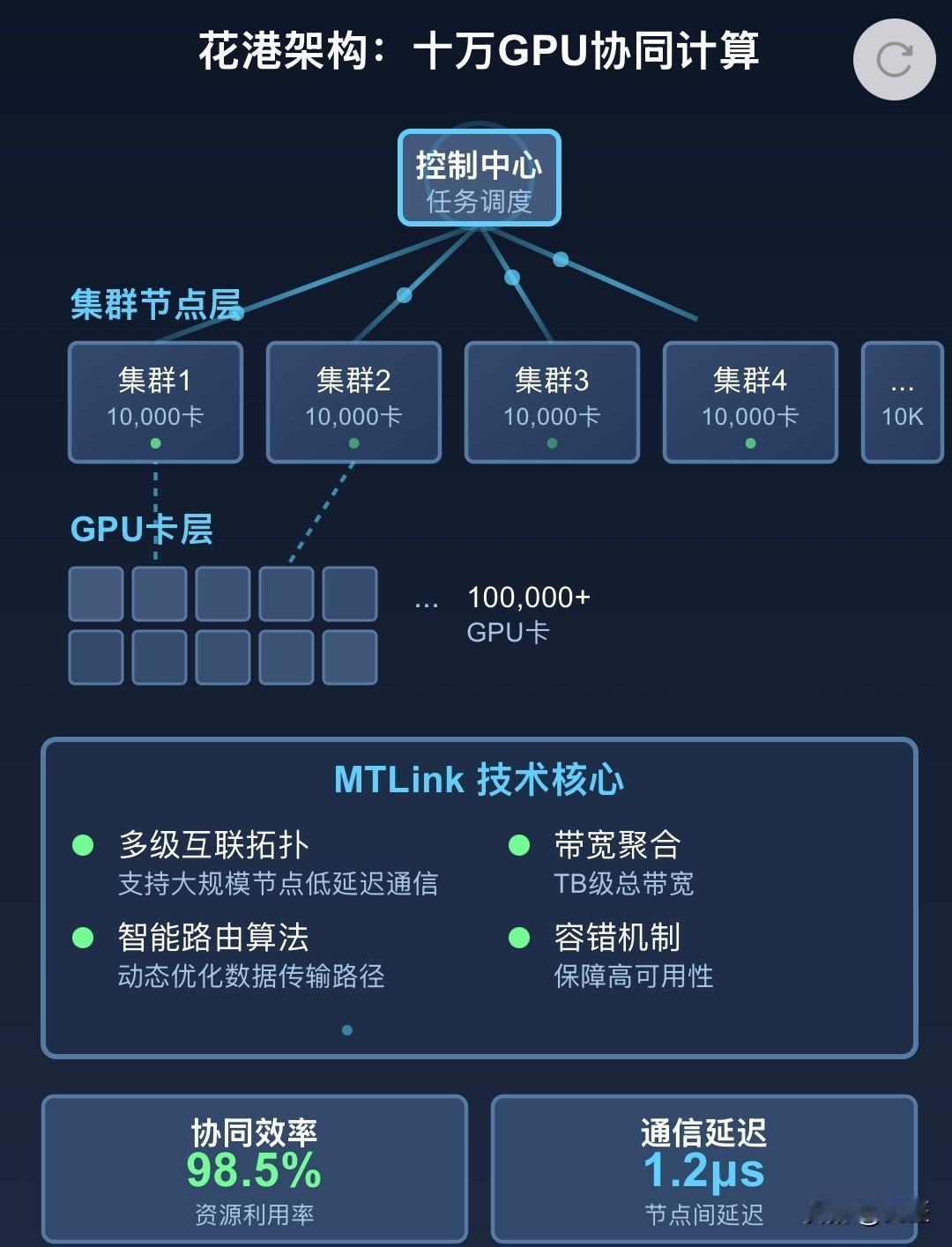 一句话摩尔线程的“花港”架构, 国产GPU终于能“打群架”了。 以前国产GPU像“单打独斗的侠客”, 现在“花港”让它变成能指挥十万大军的“武林盟主”, 单卡性能追平英伟达, 还能把十万张卡连成一台超级计算机。 为什么说“花港”是游戏规则改变者? 过去的问题:国产GPU只能做“小任务”,像让一个人搬一座山。 花港的解法:把十万个人(GPU卡)变成“共享大脑”的超级团队,通过MTLink 4.0技术实现134.5Gb/s的“脑电波同步”,搬山效率提升50倍。 关键数据:在万卡集群测试中,训练大模型的有效时间占比超过90%,相当于传统方案的3倍利用率。 摩尔线程 国产GPU gpu芯片 花港 本地chargpt