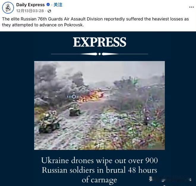 这几天,俄罗斯精锐力量俄罗斯第76近卫空降突击师反复被单独介绍,为什么呢? 该师为俄军精锐空降力量,2025年12月初,作为俄罗斯中央集团军预备队,被调往乌克兰顿涅茨克州波克罗夫斯克方向增援,他们被寄予期望巩固此前夺取的区域并突破乌克兰的防线。 乌克兰武装部队第7快速反应军团依托无人机,火炮与集束弹药,对这支部队实施多轮打击,切断了他们的后勤补给并摧毁机械化装备。 俄罗斯这支部队两天的累计伤亡大约976人,12月11日乌克兰无人机单日攻击了大约505人,并摧毁了超过20辆装甲车,俄罗斯补给线陷入瘫痪。 这件事儿被描述的时候,出现了carnage这个词,这个词什么意思呢?大屠杀。 俄乌战争
