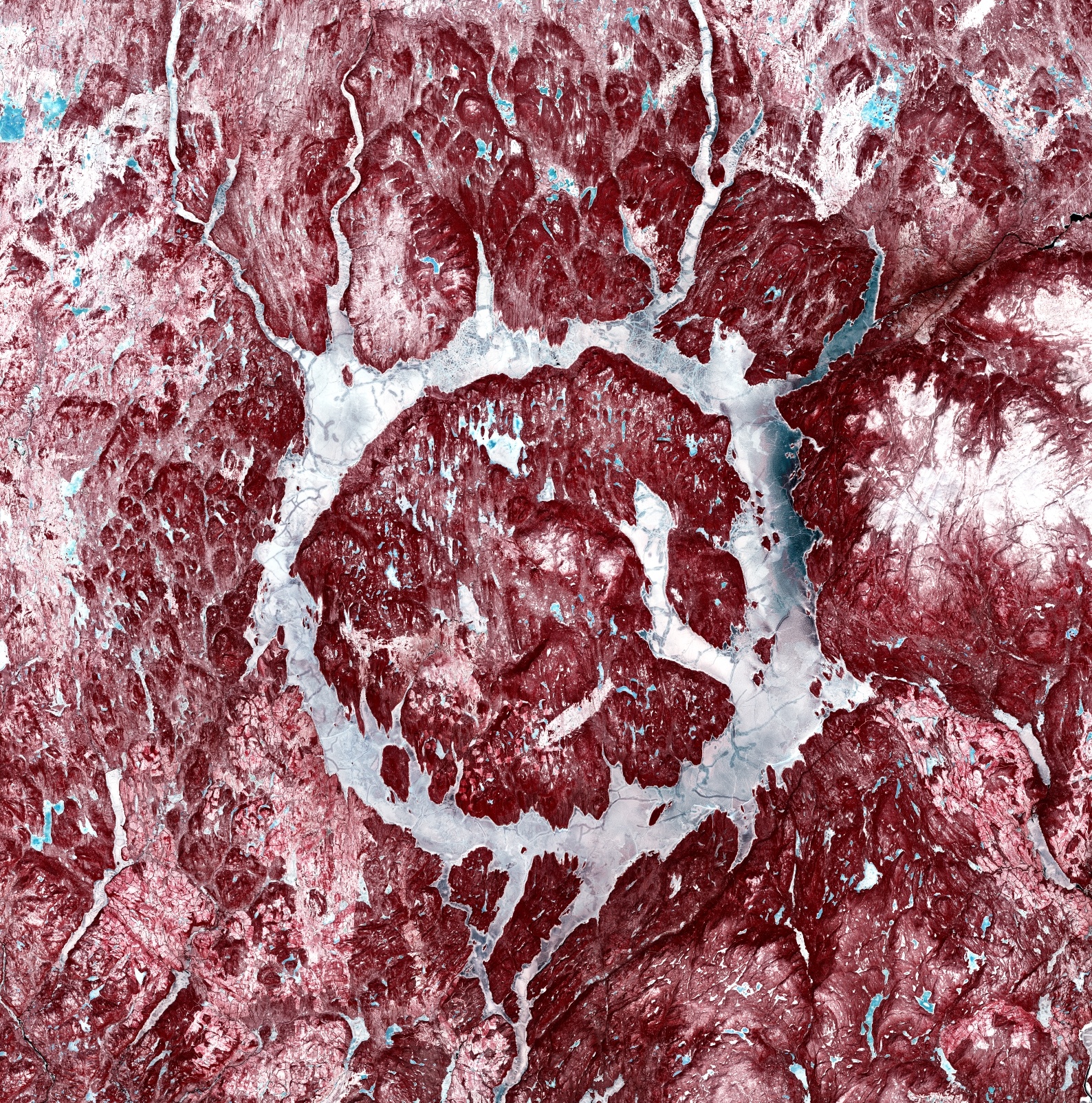 【曼尼古根陨石坑冬季影像】2025年12月19日,欧洲航天局(ESA)发布“地球从太空”冬季专题影像,展示位于加拿大魁北克省(Quebec)的曼尼古根陨石坑(Manicouagan crater)。该假彩色卫星图像呈现红白色调,远距离观看形似节日装饰球,实为距今约2.14亿年的巨型小行星撞击遗迹。该陨石坑环形水系中心为雷内-勒瓦瑟岛(René-Levasseur Island),距魁北克城东北约700公里,东西跨度72公里。据推算,撞击天体直径约5公里。环形水库即曼尼古根湖(Manicouagan lake),系20世纪60年代魁北克省水电工程产物,为全省提供水电能源。图像底部可见曼尼古根河(Manicouagan river)流出水库的河道。本图由哥白尼哨兵-2号(Copernicus Sentinel-2)卫星捕获,其搭载的高分辨率多光谱成像仪具备13个光谱波段,空间分辨率最高达10米。图像中白色区域为积雪,蓝色为冻结湖面(雷内-勒瓦瑟岛周边冰面清晰可见),红色则反映茂密植被覆盖,包括北方针叶林与苔原,该区域现为联合国教科文组织(UNESCO)指定的生物圈保护区。