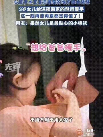 天津一位爸爸是做厨师工作,每天晚上9点半之后才下班,回到家已经是深夜了,而且双手也因为天气冷冻得通红。 3岁的女儿看见爸爸的模样,非常心疼,于是抓紧爸爸的手,想要放进自己的衣服里帮忙取暖。 但爸爸却拒绝了,因为他舍不得让女儿这样做,也怕女儿会着凉。 对此妈妈表示,自己是两个孩子的全职宝妈,家里全靠丈夫一个人工作养家,全家人都非常心疼他,而且女儿刚做完心脏手术,想把最温暖的地方留给爸爸。 而爸爸看见女儿的暖心举动,也表示为了孩子再苦再累都是值得的。 网友看完这一幕,都觉得这才是家庭的意义啊,身为家人,就是应该要互相理解互相尊重,这样才能长久地走下去。 这个女孩虽然只有3岁,但她却能明白爸爸的辛苦,看见爸爸冻得通红的手,第一时间就想帮爸爸暖手,能有这样体贴的“小棉袄”,真是这位爸爸的幸运。 而且这个女孩因为生病了,治疗肯定要花不少钱,所以爸爸只能够加倍努力工作,以此来让女儿能够恢复健康,然后再快乐地成长,这也是身为父母的一种责任。 另外妻子虽然是全职宝妈,但也能够体谅丈夫的不容易,相信在丈夫心里,他也能体谅妻子的辛苦,这样的夫妻才是真爱,这样的家庭才会有幸福。大家怎么看呢?