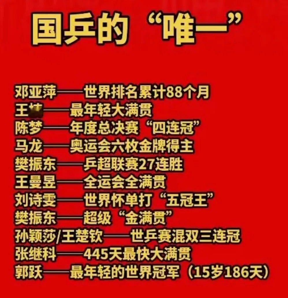 详细了解国乒的“唯一”——孙颖莎孙颖莎双圈世锦赛金满贯 女乒唯一邓亚萍—世界排名累计88个月,王楠最年轻的大满贯,陈梦年度总决赛四连冠,马龙,奥运会六枚金牌获得者,樊振东乒超联赛27连胜,王曼昱是全运会全满贯!樊振东是超级金满贯,孙颖莎/王楚钦是世乒赛混双三连冠!其实王楚钦最棒,亚运会四金王,目前没有人超越,所有的荣誉都代表过去,乒乓球运动员有一句话特别好,下了领奖台之后一切归零,所有的荣誉都代表过去,运动员的成绩都是拼出来的,经得起岁月洗礼,王楚钦第一个左手世乒赛冠军🏆,孙颖莎/王楚钦第一块混双奥运金牌,现役运动员未来无限可能,2026,国乒运动员继续加油,继续创造出属于自己的辉煌业绩!微博年度能量人物微博之夜