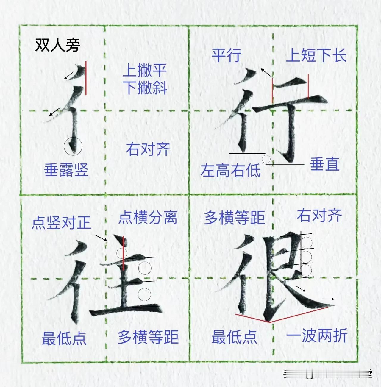 第十八课:双人旁 双人旁的书写规律: 1.上撇平,下撇斜, 长短有区分,右侧要对齐 2.竖为垂露竖,起笔要略高 3.整体略窄 墨点行书行楷练字密码字帖荆霄鹏成年连笔零基础临摹速成入门教程