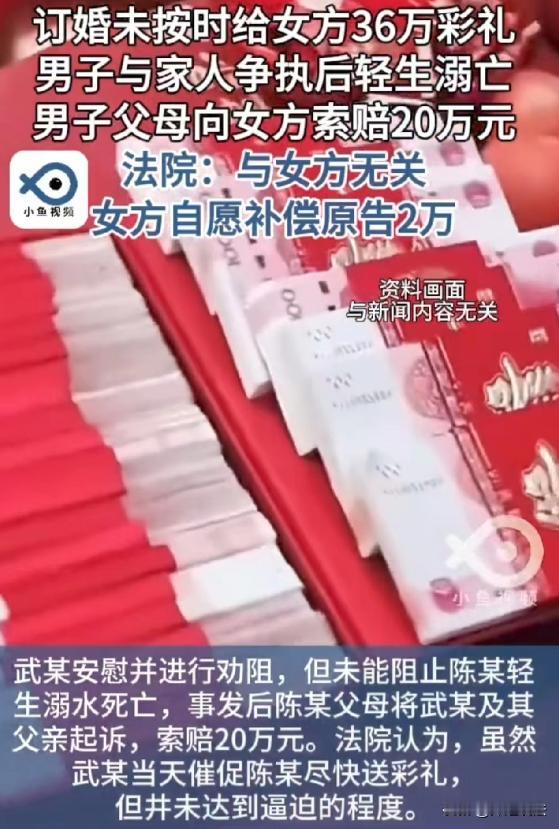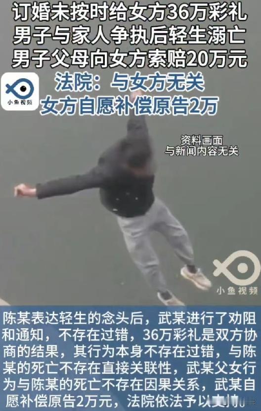 河南商丘,男子陈某和未婚妻武某订婚时,陈家承诺给36万彩礼并约定送彩礼和办婚礼时间,可到送彩礼时,陈某父母却没动静,武某催促后,陈某和父母争执,随后轻生离世,陈某父母认为是武家索要高额彩礼致儿子离世,将武某和她父亲告上法庭索赔20万。武某称已尽力劝阻陈某轻生,出于愧疚自愿补偿2万。 (来源:裁判文书网) 陈某的父母觉得儿子就是因为武家要那36万彩礼,压力太大才想不开的,他们一心想着要让武家为儿子的离世负责,所以毫不犹豫地就把武某和她父亲告上了法庭,开口就要20万赔偿。 武某心里也是委屈得不行,她觉得自己根本没做错什么,之前陈某提分手,她家二话不说就把彩礼退回去了。 后来陈某求复合,陈家承诺的彩礼,她也没逼着马上给。 而且陈某轻生的时候,她已经尽力去劝阻了。 出于愧疚,她还自愿拿出2万块作为补偿。 武某自愿补偿2万,这算不算是承认自己有责任呢? 自愿补偿,并不等同于承认自己有法律上的责任,武某可能是出于人道主义和愧疚心理才做出补偿,不能因此就认定她对陈某的死亡有法律责任。 武某和她的父亲到底该不该为陈某的死亡负责呢? 陈某父母觉得,就是因为武家要高额彩礼,才导致儿子压力过大走上绝路。 他们认为武家在这件事上有不可推卸的责任,所以要求赔偿。 而武某和她父亲则觉得,陈某作为成年人,应该对自己的行为负责。 他们没有逼迫陈某做什么,陈某轻生是他们自己和父母争执的结果,和武家没有关系。 武某还强调自己已经尽力劝阻陈某轻生,出于愧疚才自愿补偿2万。 从法律角度来看,根据《民法典》第一千一百六十五条规定,行为人因过错侵害他人民事权益造成损害的,应当承担侵权责任。 武某催要彩礼是一种合理的诉求,并没有采取违法或者逼迫的手段。 陈某的离世,是因为和父母激烈争执后轻生离世,这和武某催要彩礼之间并没有直接的因果关系。 陈某父母起诉武某和她父亲,有没有可能胜诉呢? 从目前的情况来看,胜诉的可能性不大。因为武某在催要彩礼的过程中没有过错,陈某的死亡是其自身行为导致的,和武某没有法律上的因果关系。 另外,陈某作为成年人,具有完全民事行为能力,他应该对自己的行为负责。他的自杀行为属于“受害人故意造成损害”的情况。 根据法律规定,在这种情况下,行为人不用承担赔偿责任。所以,武某和她的父亲在这起案件中不应该承担赔偿责任。 法院在审理这起案件的时候,也是充分考虑了这些因素。法院认为武某催要彩礼是合理的,没有逼迫或者违法的行为。 陈某的死亡是因为和父母争执后轻生,和武某没有直接关系。 而且武某已经尽力劝阻陈某轻生,出于愧疚自愿补偿2万,这种行为值得肯定。 最终,法院判决武某和她的父亲不承担赔偿责任,支持武某自愿补偿2万。 在处理感情和金钱问题的时候,一定要保持理性和冷静。感情是两个人的事,不能把金钱当成衡量感情的标准。 如果因为彩礼等问题产生矛盾,应该通过沟通和协商来解决,而不是采取极端的方式。 在生活中遇到类似因为彩礼产生矛盾的情况,该怎么处理呢? 双方要保持冷静,坐下来好好沟通,了解彼此的想法和需求。 如果实在无法达成一致,也可以寻求家人、朋友或者专业人士的帮助,通过调解来解决问题。 千万不要让矛盾激化,导致不可挽回的后果。 陈某父母认为武家索要高额彩礼导致儿子离世,而法律认定武某催要彩礼合理,陈某离世与武某无直接因果关系,武某无需担责。