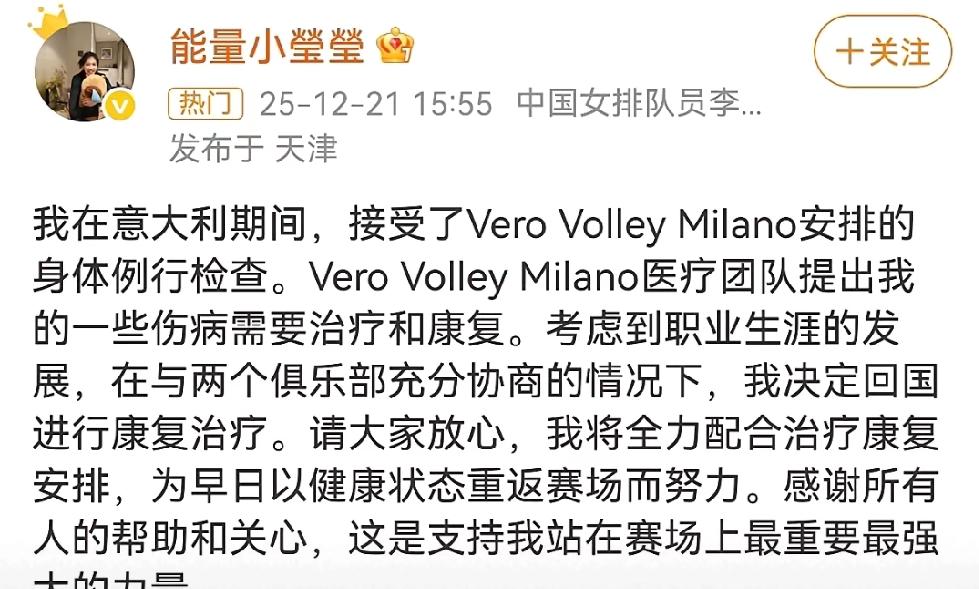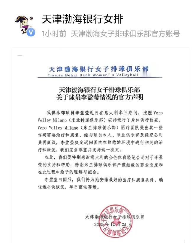 李盈莹,天津女排和米兰俱乐部三方发布声明!今天下午主攻手李盈莹发文决定回国康复治疗后,不久天津渤海银行女排也发布声明,将全力为主攻手李盈莹安排最好的医疗和康复条件。 米兰俱乐部刚刚也发布声明,后面也将积极配合主攻手李盈莹的各项需求,助力李盈莹早日康复重返赛场。 主攻手李盈莹,天津渤海银行俱乐部,米兰俱乐部三方都第一时间发布了正式声明,第一时间给关心爱护妹妹李盈莹的球迷和各界反馈消息,主攻手李盈莹最新决定回国治疗进行康复。 没想到上赛季排超联赛末尾阶段那次的崴脚受伤,影响这么大!妹妹李盈莹受伤手术后才四五个月时间,从北京医院复查出来就被拉去国家体育局进行国家队的集训。现在看来那时就让主攻手李盈莹复出去参加集训营真的是太着急了! 再到后来主攻手李盈莹跟随国家队到世联赛北京澳门站比赛,再到世锦赛总决赛的参赛,再后来又是天津女排全运会集训,再到参加全运会比赛。这一年的时间真是事情满满,没有一刻休息时间啊! 好事多磨吧!妹妹李盈莹也不用着急,一切都会好起来的。先进行康复治疗,等这次完全康复后,再计划后面的工作也不迟。天涯体育排球讯