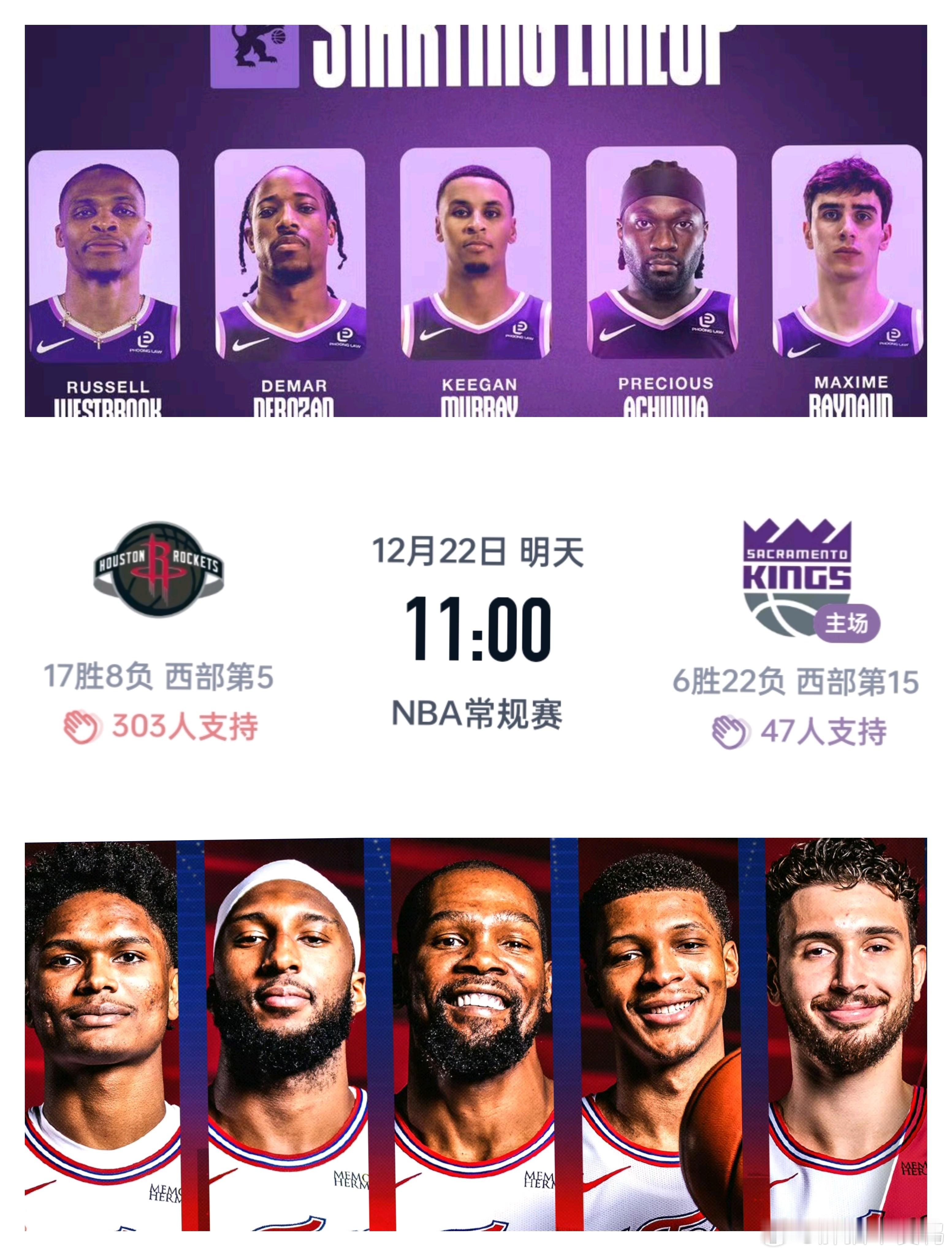 火箭国王二番战预告来了!双方均背靠背且火箭胜率高达84.3%!国王6连败板上钉钉了!ESPN预测明天火箭胜率高达84.3%!而国王仅有可怜的15.7%!而两队在本月4号的交手中,火箭以26分大胜国王,赛季ESPN预测火箭胜率高达90.5%!火箭在近期遭遇一波2连败,但好在今天打赢掘金止住连败趋势,乌杜卡在今天终于清醒了,把前两场关键时刻上头且出手数众多的申京,在今天被压得仅有9次出手,而今天这一大改变,也让火箭轻取掘金!杜兰特谢泼德狂欢!而国王这边情况就不容乐观了,随着今天败给开拓者后,本赛季已经被开拓者三杀!且每一场都是打到关键时刻,在上一场,威少被离谱吹罚导致比赛失利,国王本赛季算是彻底完了!队内多位核心均受伤缺席,明天打火箭恐又是一惨败!双方近5战及总战绩对比:火箭近5战2胜3负,总战绩17胜8负排名西部第5!国王近5战0胜5负,总战绩6胜22负排名西部第15!双方伤病名单:火箭这边——伊森(右斜肌拉伤)缺席,芬尼史密斯(脚踝伤势)缺席,范弗利特(脚踝受伤)缺席!国王这边——萨博尼斯(左膝半月板)缺席,拉文(脚踝扭伤)缺席,尤班克斯(手指脱臼)缺席,蒙克(小腿拉伤)缺席,麦克德莫特(小腿拉伤)缺席!双方预测首发名单:火箭这边——杜兰特,申京,阿门,奥科吉,小史密斯国王这边——威少,德罗赞,雷纳德,阿丘瓦,穆雷双方球队数据对比:火箭进攻效率第4,防守效率第5,净效率第2,前场篮板率第1,二次进攻得分第1!国王进攻效率第29,防守效率第24,净效率第29,抢断率第6!火箭杜兰特国王威少国王开拓者裁判报告威少吹罚无误火箭vs掘金