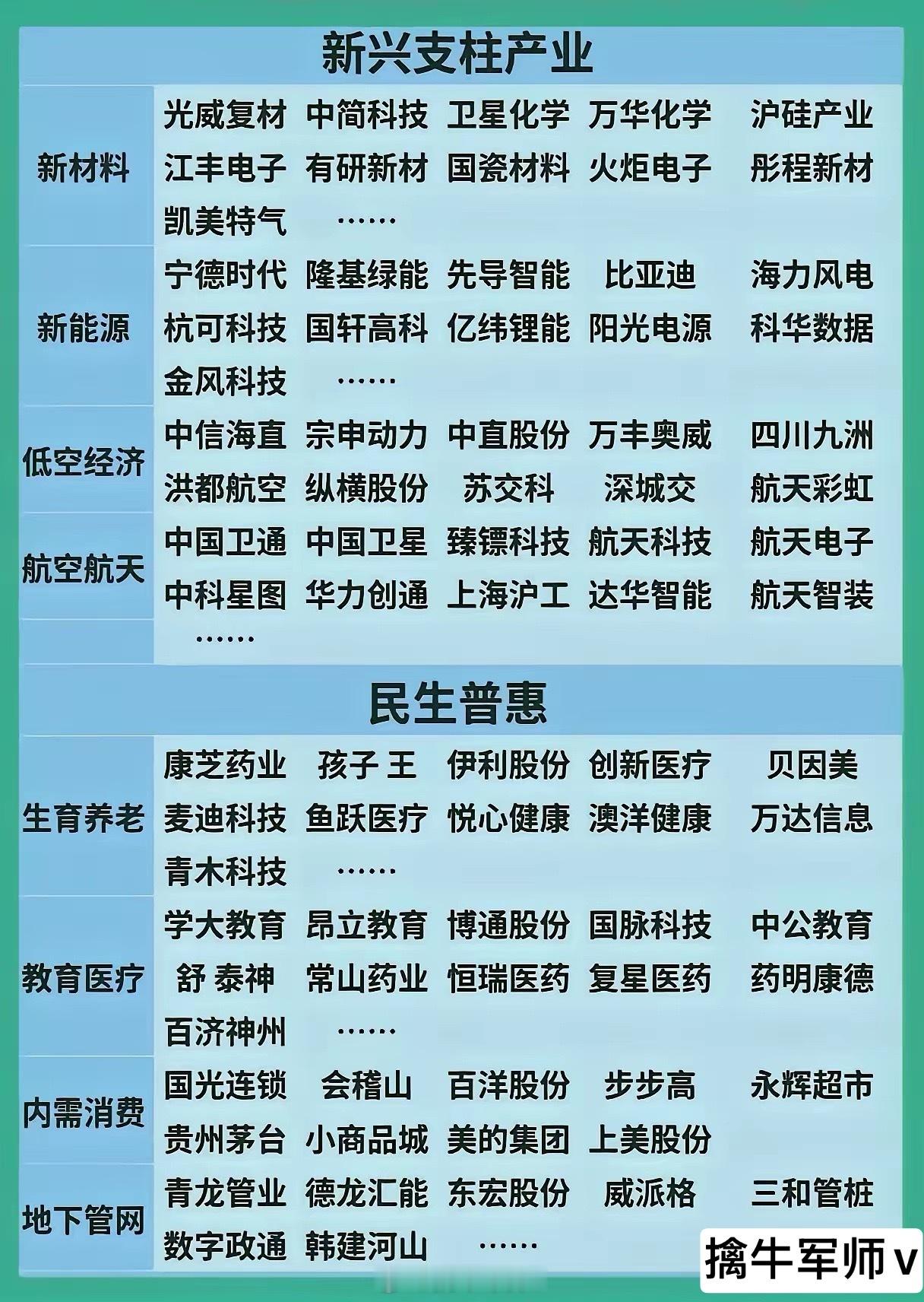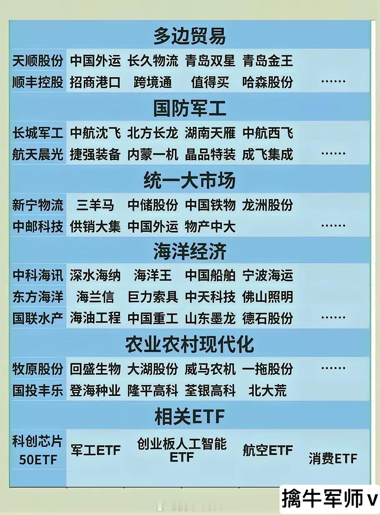 科技创新产业及企业(收藏研究):1. 聚焦科技创新,列集成电路、工业母机、量子科技、人工智能、生物制造、氢能/核聚变、脑机接口、具身智能、6G等领域及代表企业;2. 新兴支柱产业(新材料、新能源、低空经济、航空航天)与民生普惠(生育养老、教育医疗、内需消费、地下管网),附各领域企业;3. 多边贸易、国防军工、统一大市场、海洋经济、农业农村现代化等板块及对应企业,并列出相关ETF(如科创芯片50ETF、军工ETF等)。