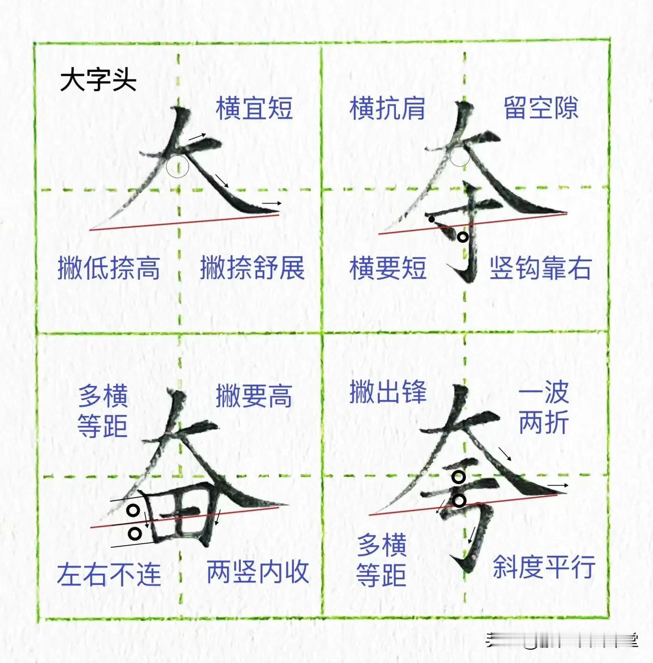 第十九课:大字头 大字头的书写规律: 1.第一笔横画要略短,呈左低右高的斜度 2.撇捺要舒展打开,撇捺在上,撇低捺高 3.撇要出锋,捺要出脚 捺画一波两折 书法 墨点行书行楷练字密码字帖荆霄鹏成年连笔零基础临摹速成入门教程