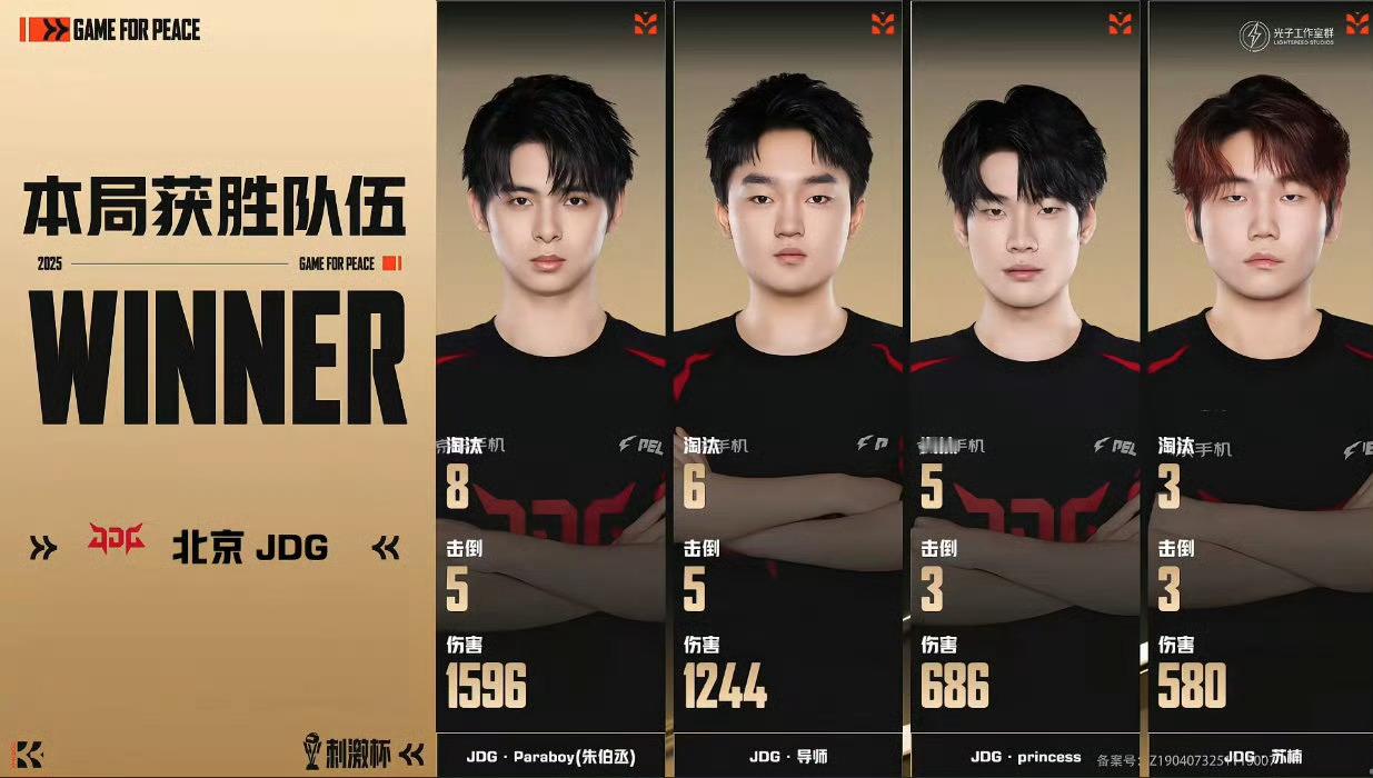 JDG狂揽22淘汰吃鸡伞兵刺激杯单局MVP【2025和平精英刺激杯】突围赛(线上赛)Day2 第五场获胜队伍:MVP:(朱伯丞)截至本场总积分榜第一名:第二名:第三名:第四名:第五名:截至本场淘汰榜第一名:(朱伯丞)第二名:第三名:第四名:第五名: