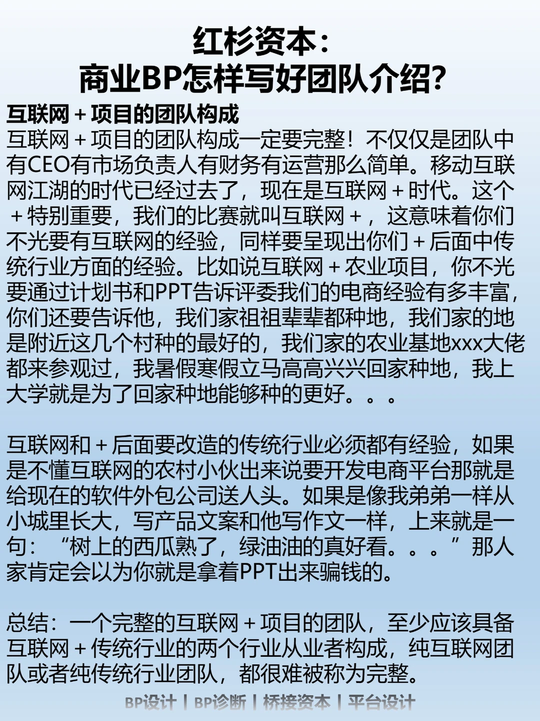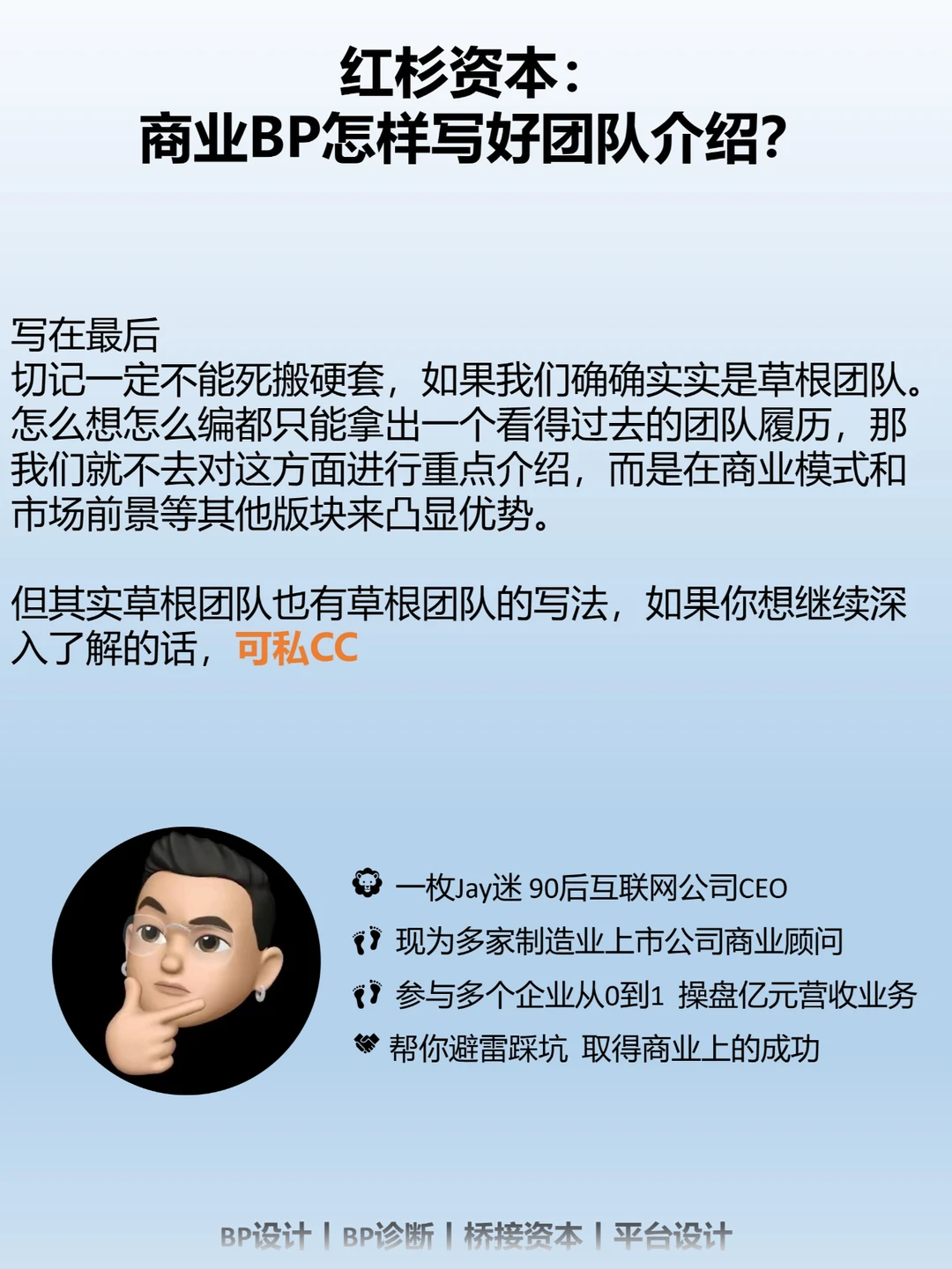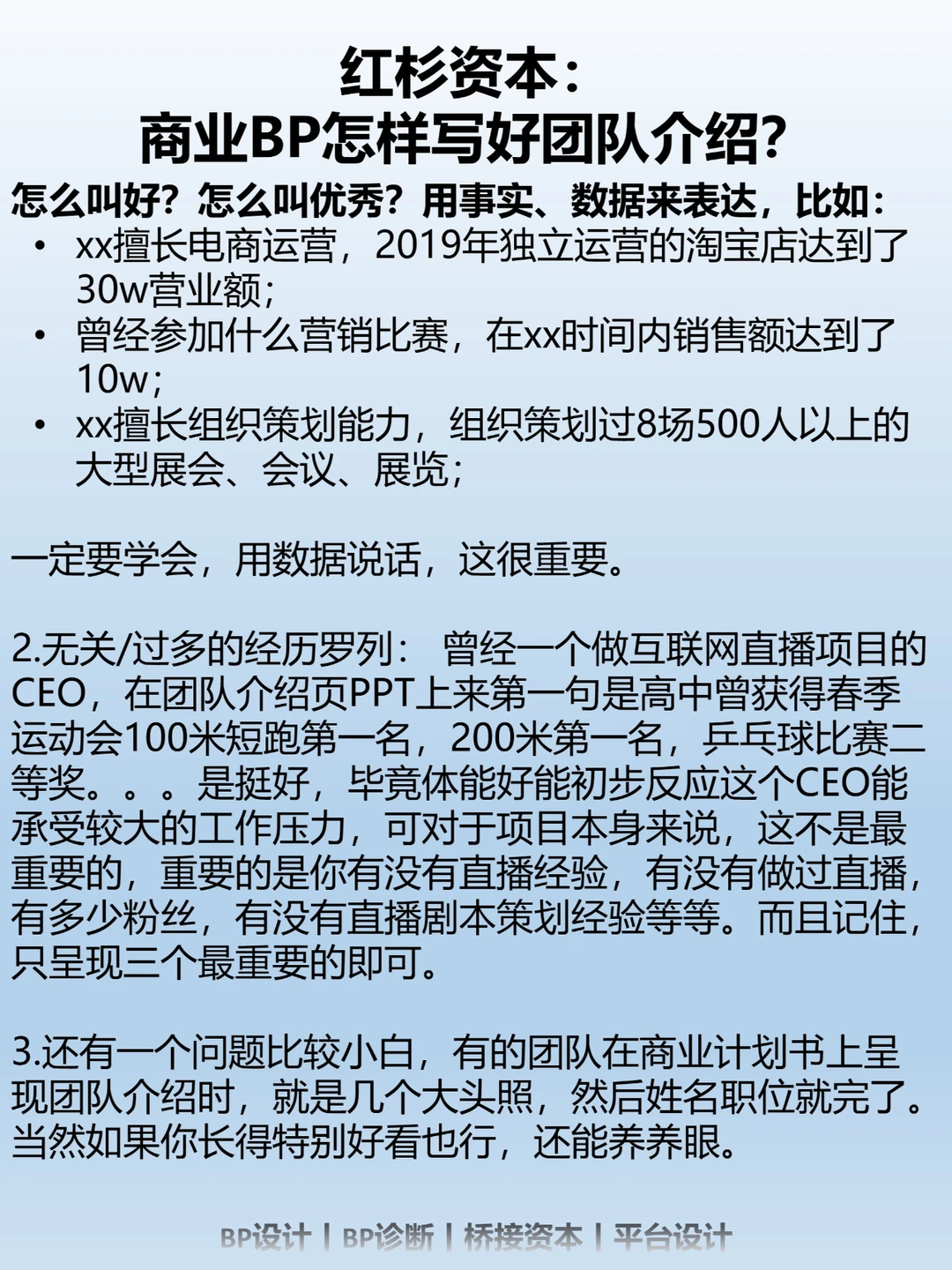 切记一定不能死搬硬套,如果我们确确实实是草根团队。怎么想怎么编都只能拿出一个看得过去的团队履历,那我们就不去对这方面进行重点介绍,而是在商业模式和市场前景等其他版块来凸显优势。