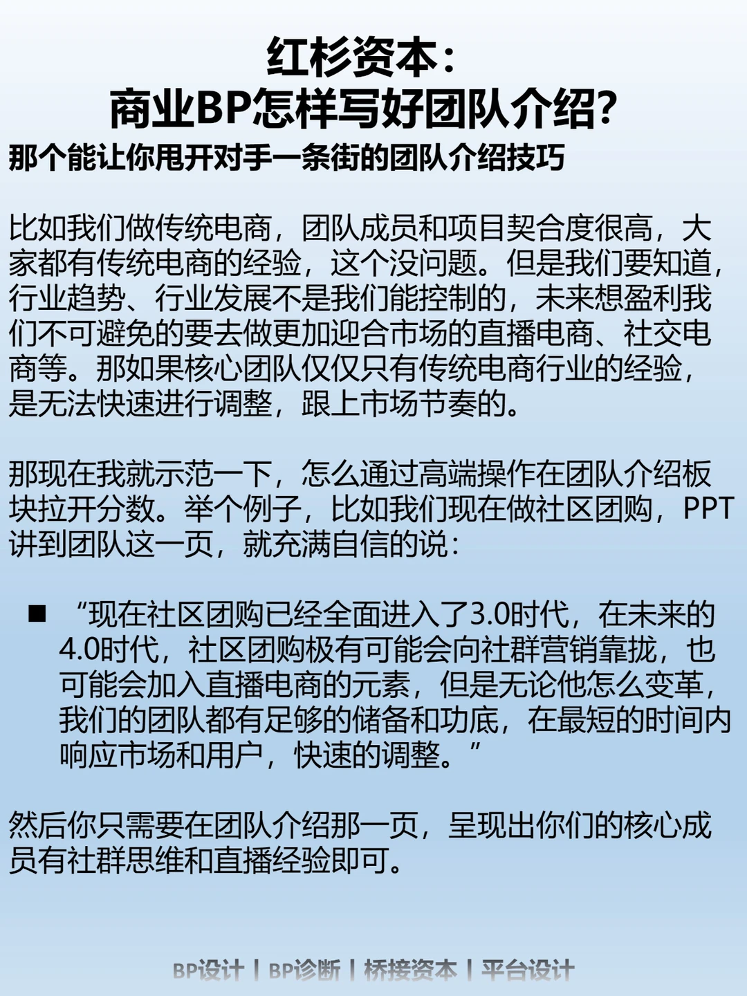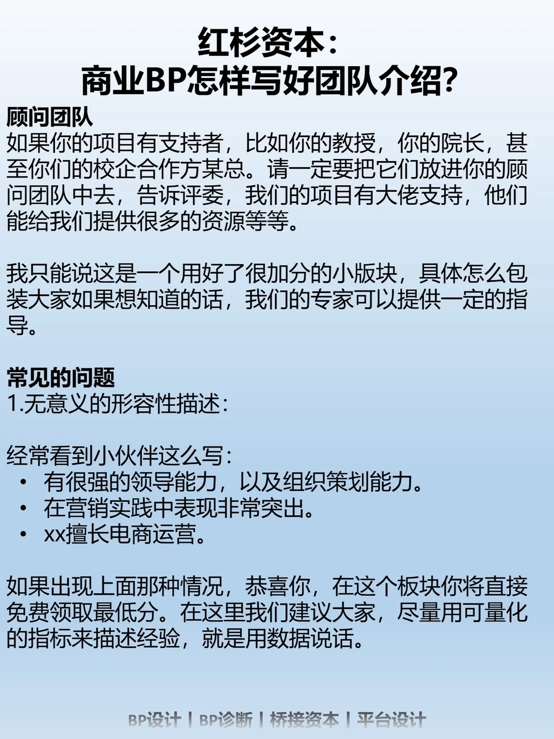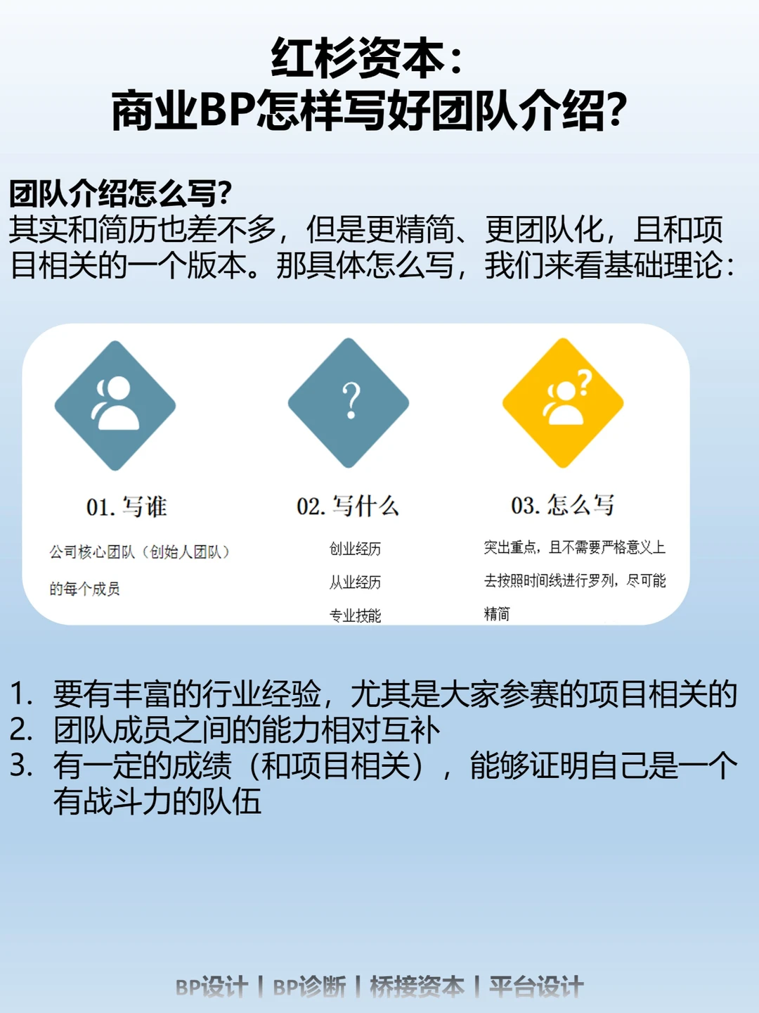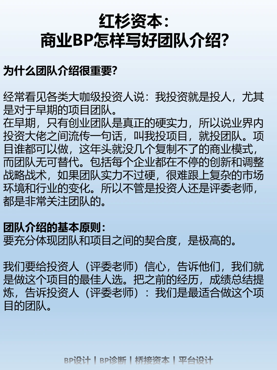 切记一定不能死搬硬套,如果我们确确实实是草根团队。怎么想怎么编都只能拿出一个看得过去的团队履历,那我们就不去对这方面进行重点介绍,而是在商业模式和市场前景等其他版块来凸显优势。