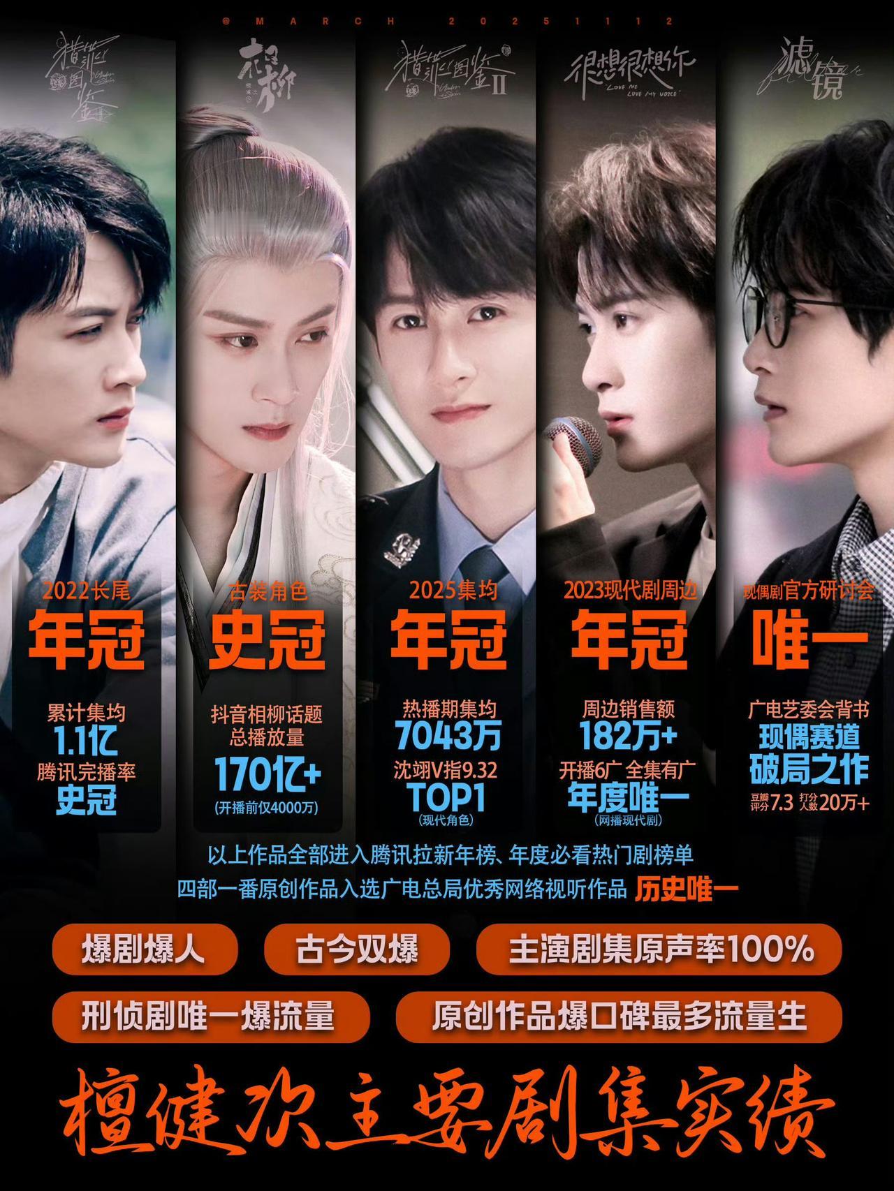 檀健次在2025年腾讯视频星光大赏中同时斩获年度星光演员、VIP之星和年度jump勋章三项荣誉,综艺、舞台、时尚全面开花,实至名归。 檀健次太权威了,单人奖有、jump奖有、vip之星有、高定高珠超季有、座位红毯待遇有、粉丝灯牌有、帅气有、咖位有! 这也是檀健次继2023年获得“年度全能艺人”和“VIP之星”后,再次成为星光大赏多奖得主! 我只能说人家都做国际电影节的评委了,没记错的话是国家举办的金树林之夜那时候只有檀健次老师一位大流量出席,还凭《猎罪图鉴2》拿了最佳男主角,星光大赏这种典礼给他多少奖都是不意外,最大奖给到檀健次也是实至名归的。实力是根本,流量是加分。 檀健次今年主演的四部作品《猎罪图鉴》《滤镜》都入选了国家广电总局优秀网络视听作品,数量断层领先;同时他担任了北京国际电影节评委及白玉兰青年推广大使! 其中《猎罪图鉴2》热播期集均播放量达7043万,登顶2025年现代剧榜首;电影《震耳欲聋》以3000万成本撬动2.57亿票房,豆瓣开分7.6并获残联推荐。 檀健次获奖感言:大家晚上好我是演员檀健次,感谢所有幕后的工作人员,大家都辛苦了,今天已经很晚了,你们都辛苦了;星光也很像每个角色散发出来的微光,也感谢所有观众朋友,让这份微光被看见,也感谢一直给我力量的小炭火们! 记得23年檀健次获得星光大赏年度全能艺人时发表获奖感言,他说在做好一名演员的同时也在默默地去完成自己儿时的梦想!希望带给大家更多的影视作品,音乐作品还有舞台作品! 优秀演员已是难得,多栖发展更见实力。全能檀健次,当之无愧!恭喜年度星光演员檀健次,3个奖项实至名归!