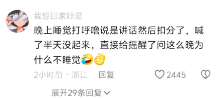 晚上睡觉打呼噜说是讲话然后扣分了,喊了半天没起来,直接给摇醒了问这么晚为什么不睡觉