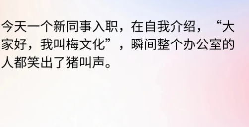 今天一个新同事入职,在自我介绍,“大家好,我叫梅文化”,瞬间整个办公室的人都笑出了猪叫声