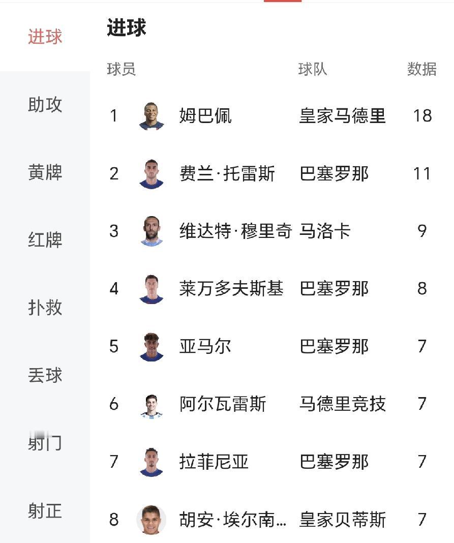 姆巴佩在皇马有多难,从射手榜和助攻榜就看得出来……! 射手榜: 姆巴佩以18球遥遥领先,第二名是11球的巴萨球员费兰·托雷斯,但是前八名里面还有另外三名巴萨球员,分别是莱万8球,亚马尔7球,拉菲尼亚7球,姆巴佩就是被巴萨球员重重包围,但是他自己“杀”出一条血路,稳居射手榜第一! 助攻榜: 巴萨球员依然霸榜,亚马尔7次,拉斯福德7次,佩德里5次,前八里面皇马仅有维尼修斯上榜,他助攻5次,巴萨球员不仅能进球,助攻也是一把好手,关键不止一个人,他们是集团作战能力强大,不像皇马,只能靠姆巴佩突击……! 这也不难理解为什么现在巴萨竞争皇马4分,因为巴萨不靠单兵作战,他们是一个团队,依靠强大的团队能力解决问题!而皇马的姆巴佩,显得有点孤立无援……!姆巴佩 皇家马德里
