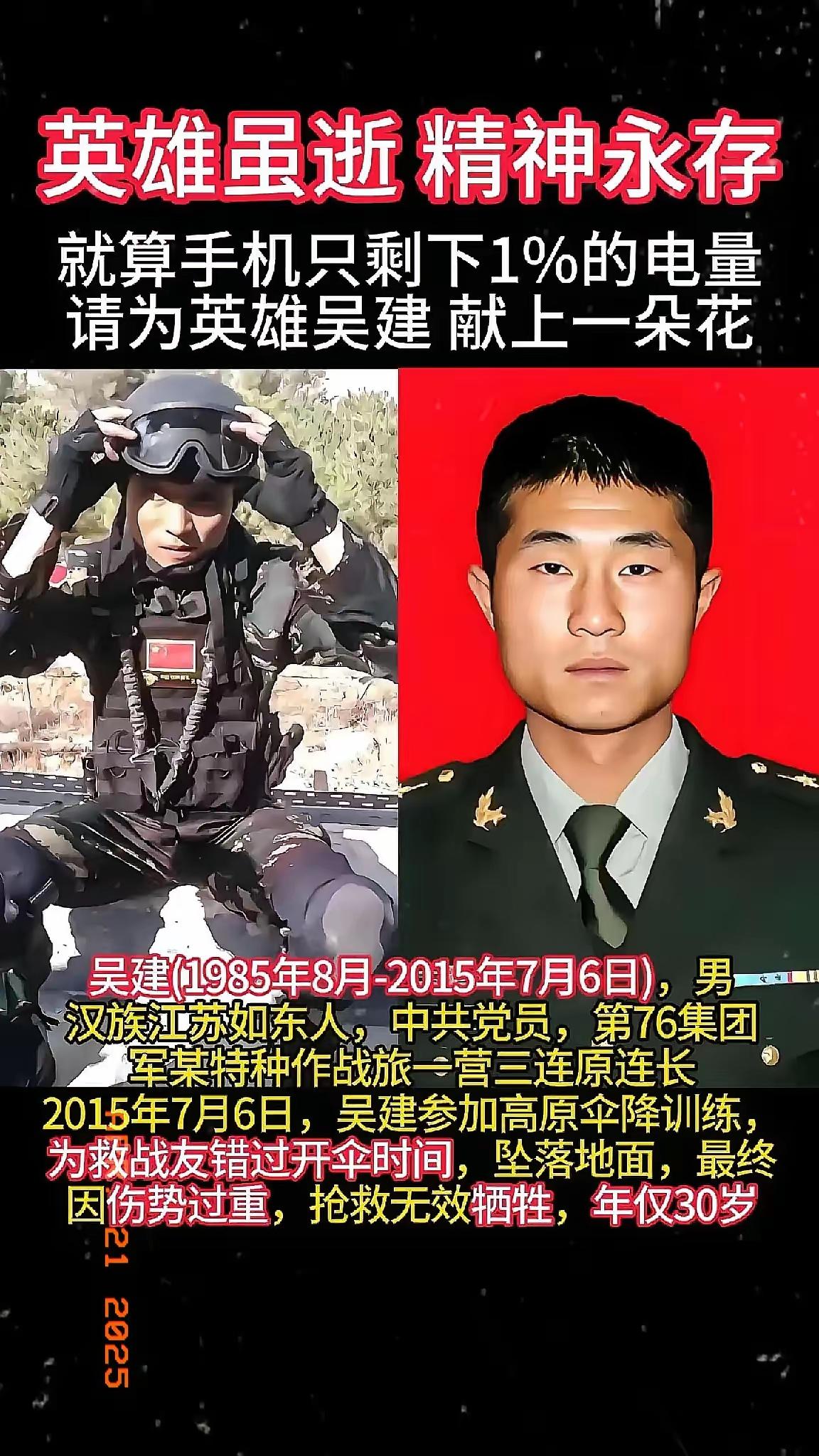 缅怀英雄,致敬英雄。 吴建,1985年8月生于江苏如东烈士家庭,17岁入伍,后就读解放军国际关系学院,毕业后回兰州军区,任第76集团军某特种作战旅连长,入伍13年参加重大军事活动20余次,两次赴外观摩培训。 2015年7月6日,格尔木高原伞降训练中,吴建作为第四十九架次第三名跳伞员,跃出舱门后与第二名跳伞员相撞致两伞相插。对方让其飞伞自保,他却担心飞伞会危及战友,喊出“飞伞你有危险,先别动,我来处置!”,两次放弃飞伞机会,落地前将两人分开,自己因高度过低未及开备份伞坠地重伤,经抢救无效牺牲,用生命诠释了舍己为人的担当。真能量 缅怀英雄