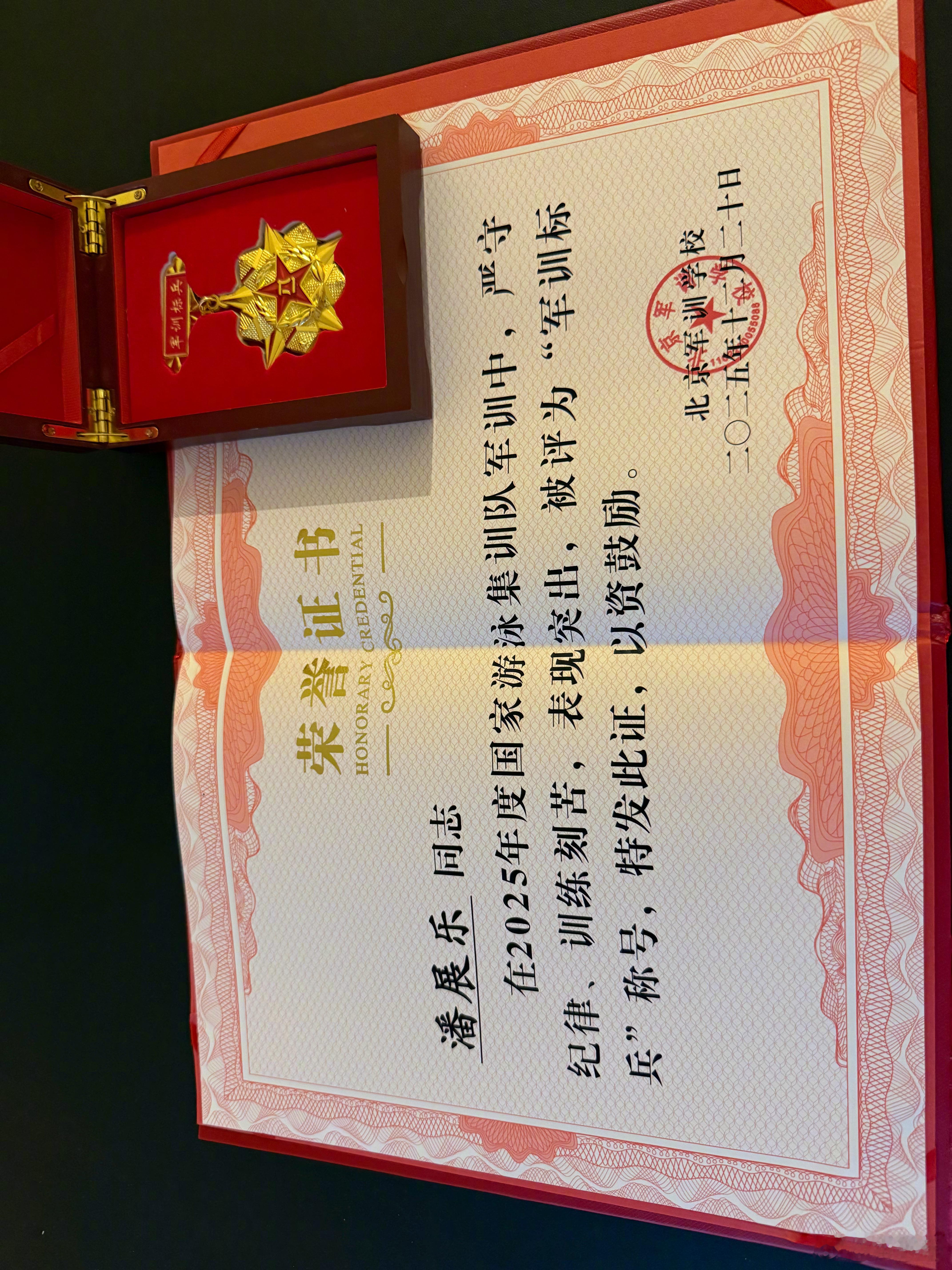 潘展乐晒军训标兵证书 游泳运动员分享了2025年度国家游泳集训队军训的照片,并晒出自己“军训标兵”的证书:“因训练刻苦、表现突出,被评为“军训标兵”称号。”