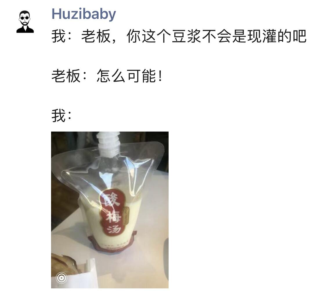 我:老板,你这个豆浆不会是现灌的吧 老板:怎么可能