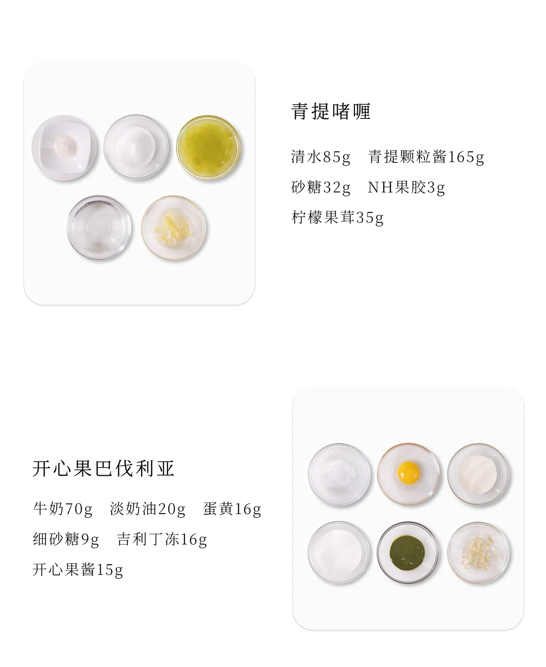 青提颗粒酱、柠檬果茸和清水搅拌加热至40°C,倒入拌匀的NH果胶和砂糖快速搅拌煮沸离火,注入11连圆柱模具至6-7成满后冷冻冻硬。