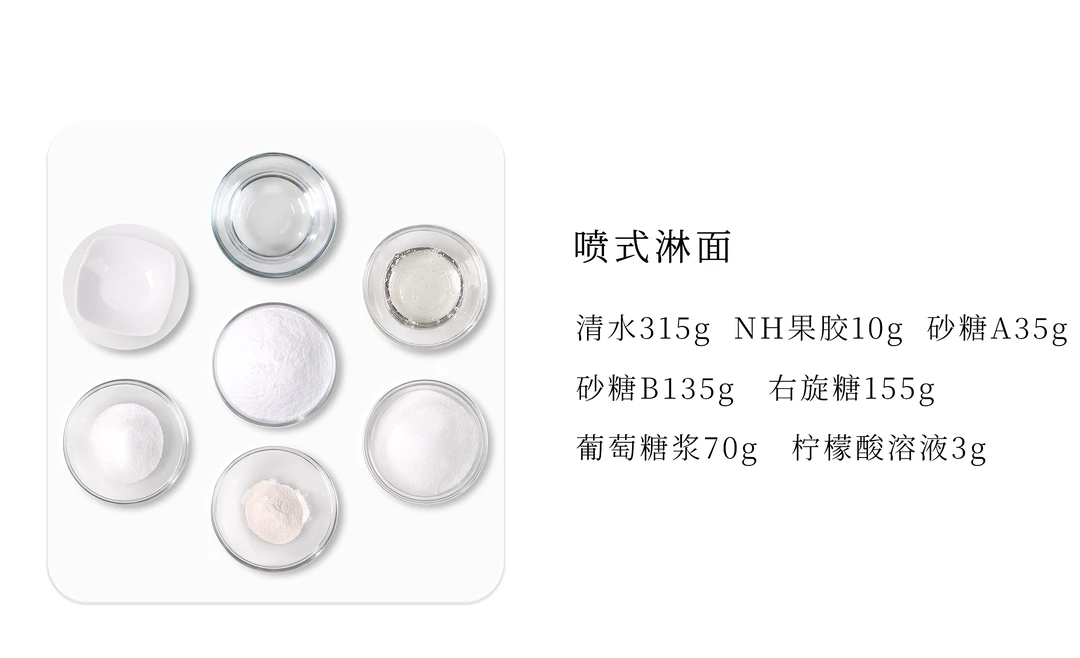 2、葡萄糖浆、清水、砂糖B和右旋糖混合加热至40°C,加入步骤1的砂糖和果胶部分继续加热至沸腾后,加入柠檬酸溶液继续加热持续煮沸100秒离火,用蛋抽蘸取少量淋面液进行凝珠测试,至可以在蛋抽上快速凝结成珠状即可。