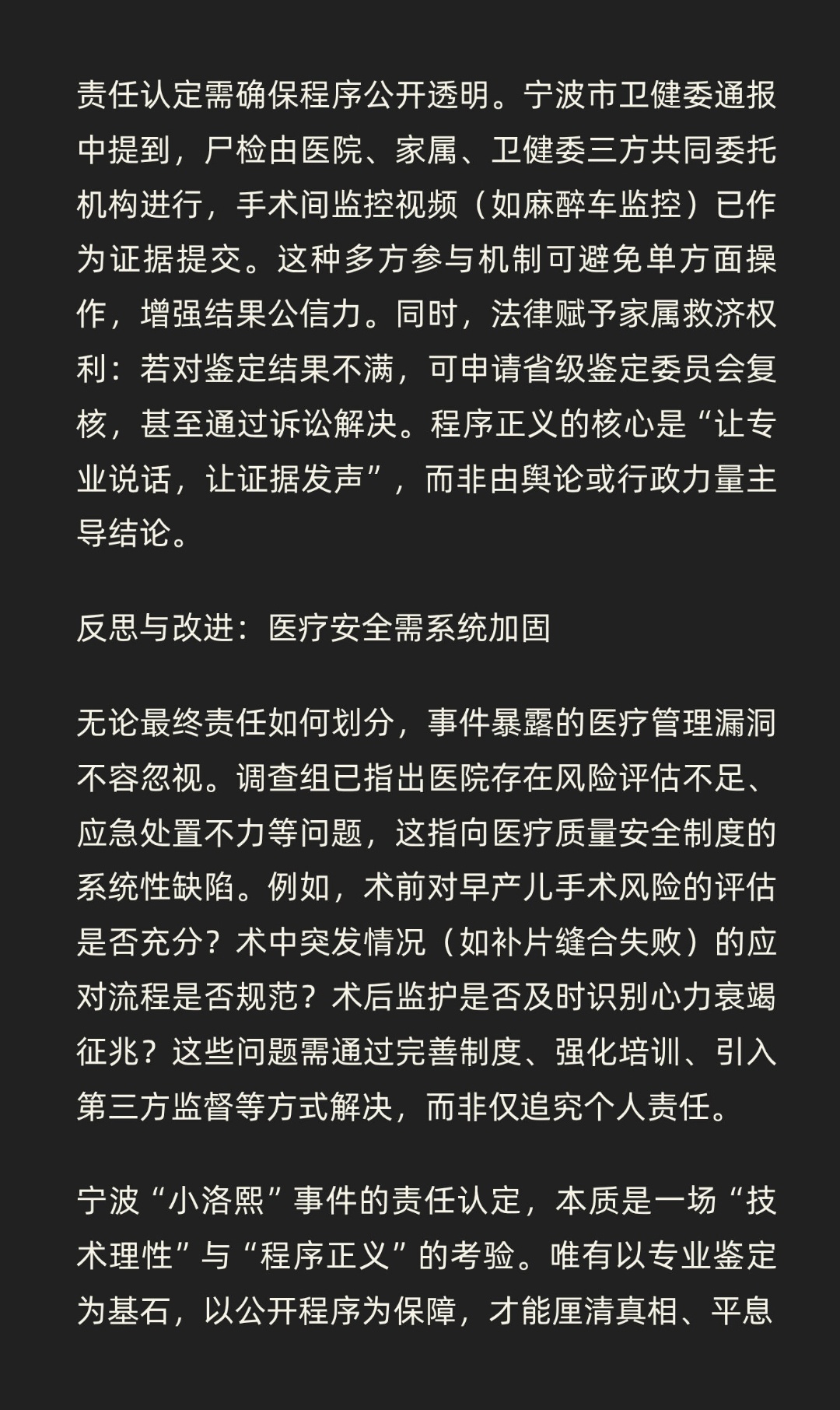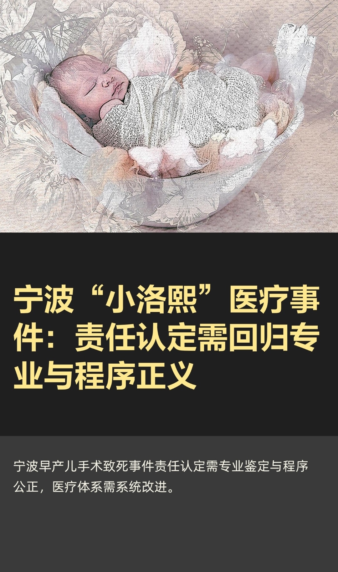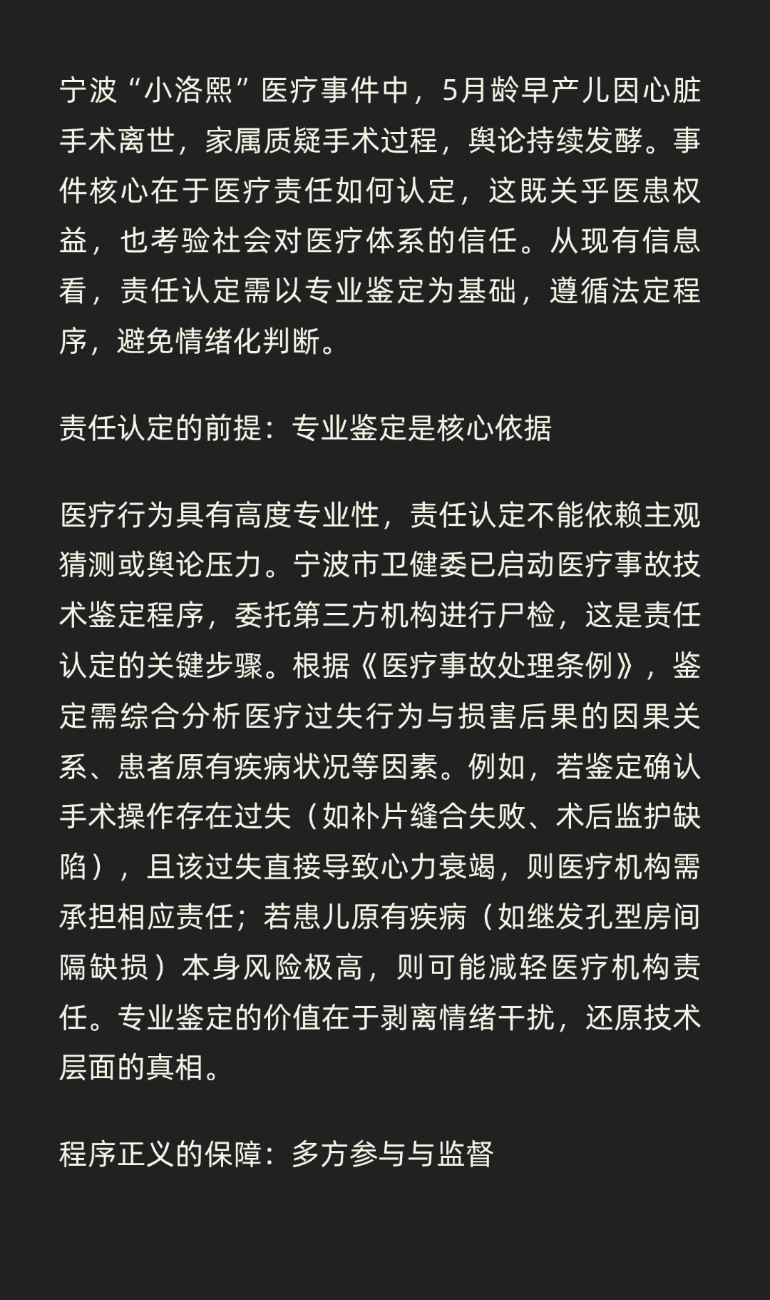 | 宁波“小洛熙”医疗事件中,5月龄早产儿因心脏手术离世,家属质疑手术过程,舆论持续发酵。事件核心在于医疗责任如何认定,这既关乎医患权益,也考验社会对医疗体系的信任。从现有信息看,责任认定需以专业鉴定为基础,遵循法定程序,避免情绪化判断。医疗行为具有高度专业性,责任认定不能依赖主观猜测或舆论压力。宁波市卫健委已启动医疗事故技术鉴定程序,委托第三方机构进行尸检,这是责任认定的关键步骤。根据《医疗事故处理条例》,鉴定需综合分析医疗过失行为与损害后果的因果关系、患者原有疾病状况等因素。例如,若鉴定确认手术操作存在过失(如补片缝合失败、术后监护缺陷),且该过失直接导致心力衰竭,则医疗机构需承担相应责任;若患儿原有疾病(如继发孔型房间隔缺损)本身风险极高,则可能减轻医疗机构责任。专业鉴定的价值在于剥离情绪干扰,还原技术层面的真相。责任认定需确保程序公开透明。宁波市卫健委通报中提到,尸检由医院、家属、卫健委三方共同委托机构进行,手术间监控视频(如麻醉车监控)已作为证据提交。这种多方参与机制可避免单方面操作,增强结果公信力。同时,法律赋予家属救济权利:若对鉴定结果不满,可申请省级鉴定委员会复核,甚至通过诉讼解决。程序正义的核心是“让专业说话,让证据发声”,而非由舆论或行政力量主导结论。无论最终责任如何划分,事件暴露的医疗管理漏洞不容忽视。调查组已指出医院存在风险评估不足、应急处置不力等问题,这指向医疗质量安全制度的系统性缺陷。例如,术前对早产儿手术风险的评估是否充分?术中突发情况(如补片缝合失败)的应对流程是否规范?术后监护是否及时识别心力衰竭征兆?这些问题需通过完善制度、强化培训、引入第三方监督等方式解决,而非仅追究个人责任。宁波“小洛熙”事件的责任认定,本质是一场“技术理性”与“程序正义”的考验。唯有以专业鉴定为基石,以公开程序为保障,才能厘清真相、平息争议,并推动医疗体系从个案反思中走向更安全、更透明的未来。