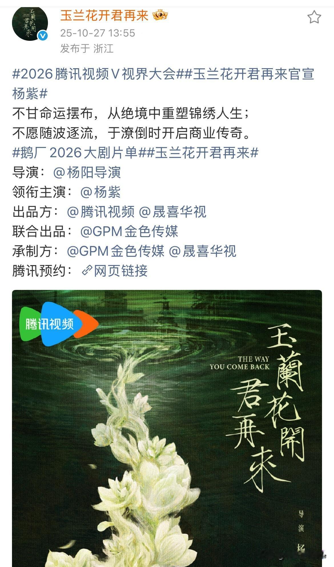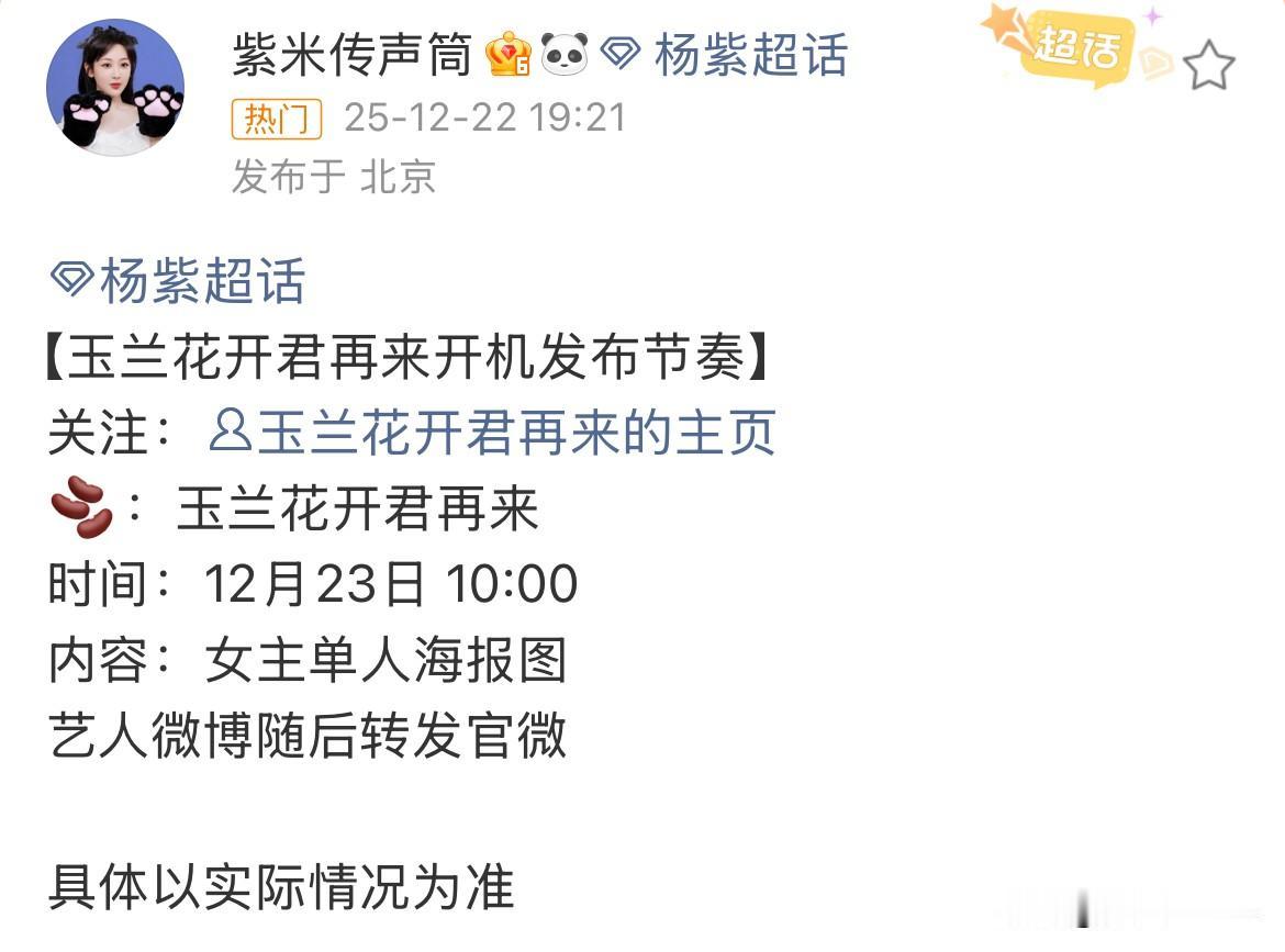 12月22日,《玉兰花开君再来》开机官宣! 杨紫在海口围读多日,网传男主一个都不